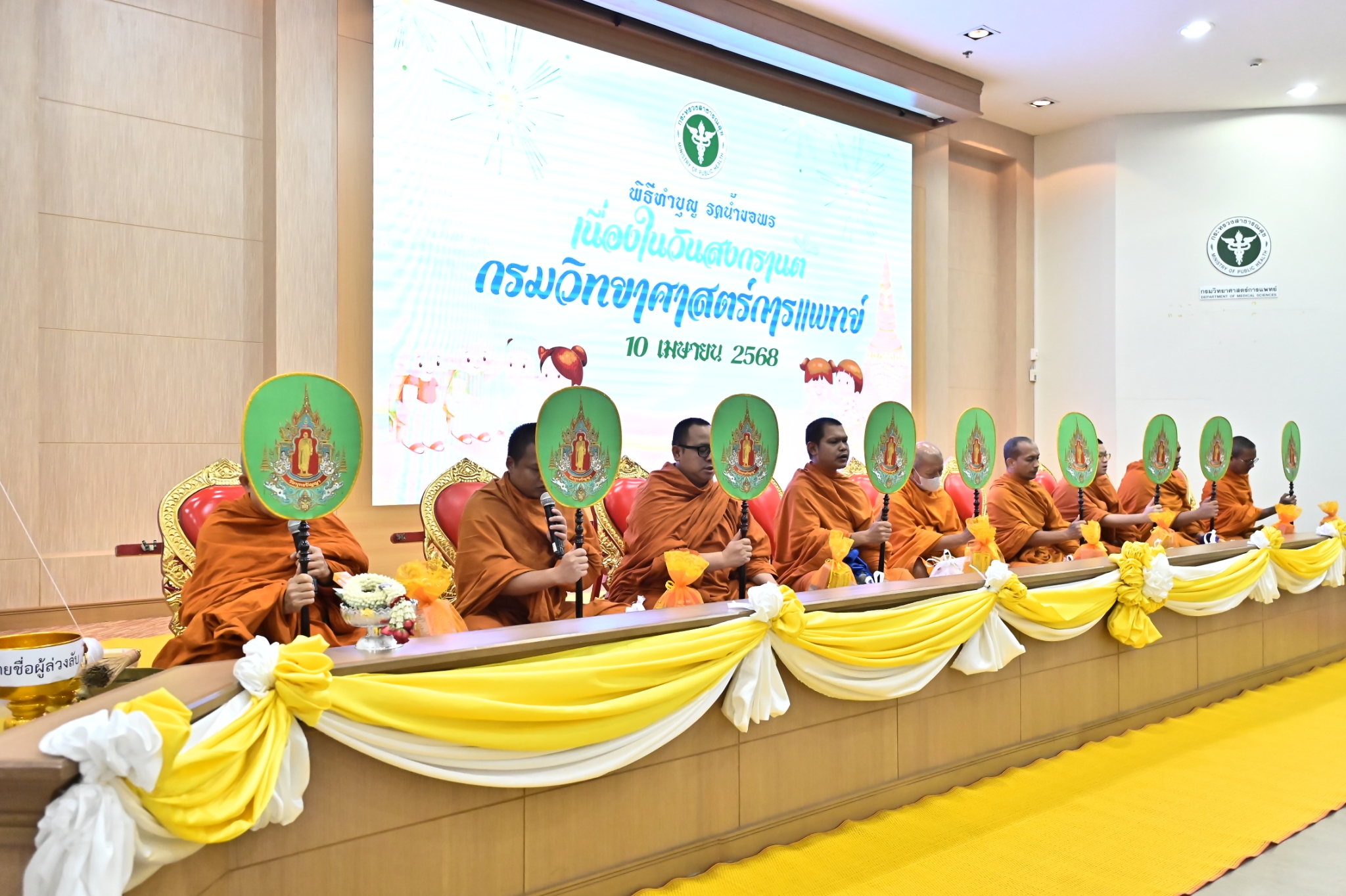 โดยนายแพทย์ยงยศ ธรรมวุฒิ อธิบดีกรมวิทยาศาสตร์การแพทย์ เป็นประธานพิธี ซึ่งได้นิมนต์พระสงฆ์ จำนวน 9 รูป โดยมี นายแพทย์พิเชฐ บัญญัติ รองอธิบดีกรมวิทยาศาสตร์การแพทย์ นายแพทย์บัลลังก์ อุปพงษ์ รองอธิบดีกรมวิทยาศาสตร์การแพทย์ นายแพทย์วัชรพงษ์ คำหล้า รองอธิบดีกรมวิทยาศาสตร์การแพทย์ พร้อมด้วยอดีตผู้บริหาร ผู้บริหารปัจจุบัน ข้าราชการ และเจ้าหน้าที่กรมวิทยาศาสตร์การแพทย์เข้าร่วมพิธี ณ ห้องประชุม 110 ชั้น 1 อาคาร 100 ปี การสาธารณสุขไทย กรมวิทยาศาสตร์การแพทย์ วันที่ 10 เมษายน พ.ศ.2568