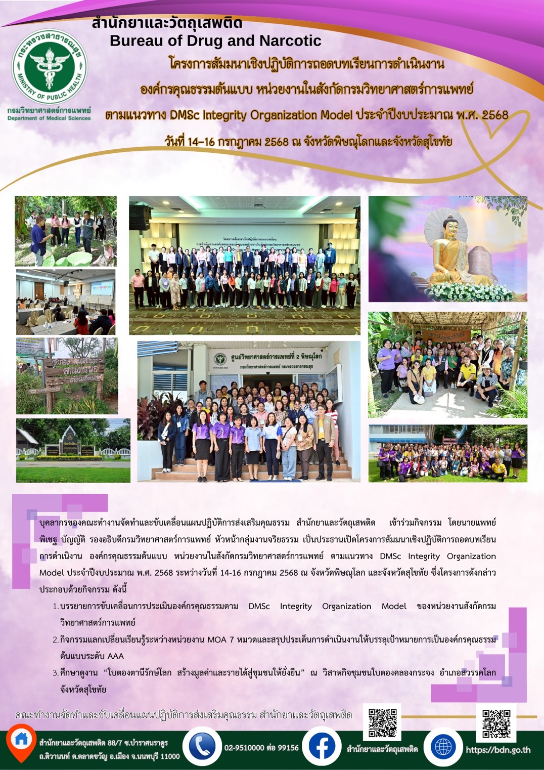 นายแพทย์พิเชฐ บัญญัติ รองอธิบดีกรมวิทยาศาสตร์การแพทย์ หัวหน้ากลุ่มงานจริยธรรม เป็นประธานเปิดโครงการสัมมนาเชิงปฏิบัติการถอดบทเรียน การดำเนินงานองค์กรคุณธรรมต้นแบบหน่วยงานในสังกัดกรมวิทยาศาสตร์การแพทย์ ตามแนวทางการ DMSc Integrity Organization Model ประจำปีงบประมาณ พ.ศ. 2568 ระหว่างวันที่ 14 - 16 กรกฎาคม 2568 ณ จังหวัดพิษณุโลก และจังหวัดสุโขทัย มีวัตถุประสงค์ เพื่อสนับสนุนให้การดำเนินงานองค์กรคุณธรรมมีความต่อเนื่อง ส่งเสริมการมีส่วนร่วม สนับสนุนการสร้างเครือข่ายคุณธรรม จริยธรรม ทั้งภายในและภายนอกหน่วยงานกรมวิทยาศาสตร์ การแพทย์ พร้อมทั้งเปิดโอกาสให้เกิดการแลกเปลี่ยนเรียนรู้นำองค์ความรู้จากการถอดบทเรียนมาขยายผลและพัฒนาสู่การเป็นองค์กรคุณธรรมต้นแบบต่อไป นอกจากนี้ยังเป็นการส่งเสริมให้บุคลากรมีคุณธรรมจิตอาสา เสียสละ ยึดถือประโยชน์ส่วนรวม มีความสามัคคี ตามจุดมุ่งหมาย คนคุณธรรม องค์กรคุณธรรม กิจกรรมประกอบด้วย