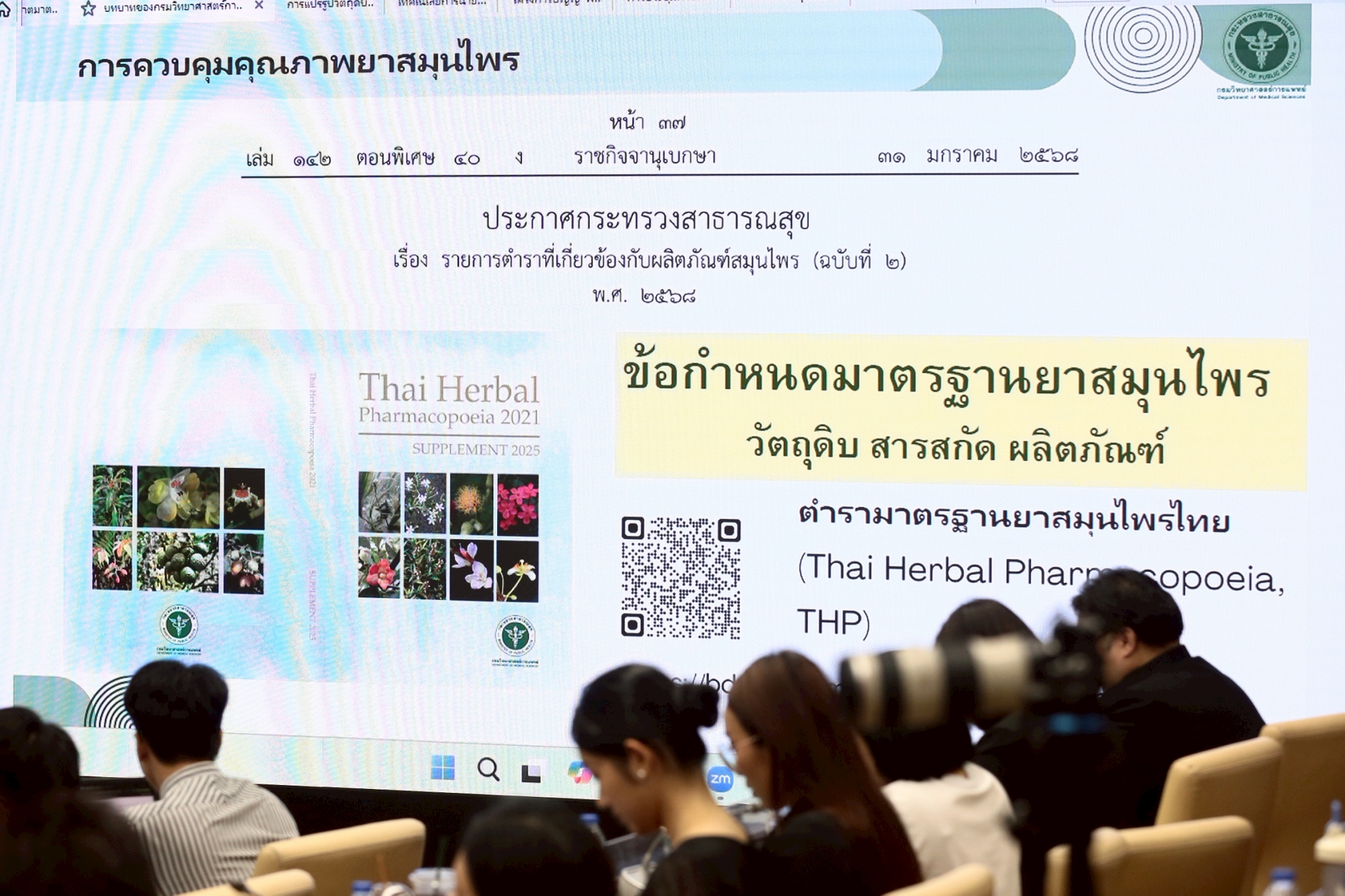วันที่ 7 พฤศจิกายน พ.ศ. 2568 ดร.นพ.สราวุฒิ บุญสุข อธิบดีกรมวิทยาศาสตร์การแพทย์ มอบหมายให้ ภญ.ศิริวรรณ ชัยสมบูรณ์พันธ์ ผู้อำนวยการสำนักยาและวัตถุเสพติด รักษาการในตำแหน่งผู้ทรงคุณวุฒิด้านวิจัยและพัฒนาวิทยาศาสตร์การแพทย์ (เคมี) พร้อมด้วย นายสันตกิจ นิลอุดมศักดิ์ ผู้อำนวยการสถาบันวิจัยสมุนไพร เข้าร่วมการประชุมพัฒนาอุตสาหกรรมสมุนไพร “ยาดมสมุนไพร”