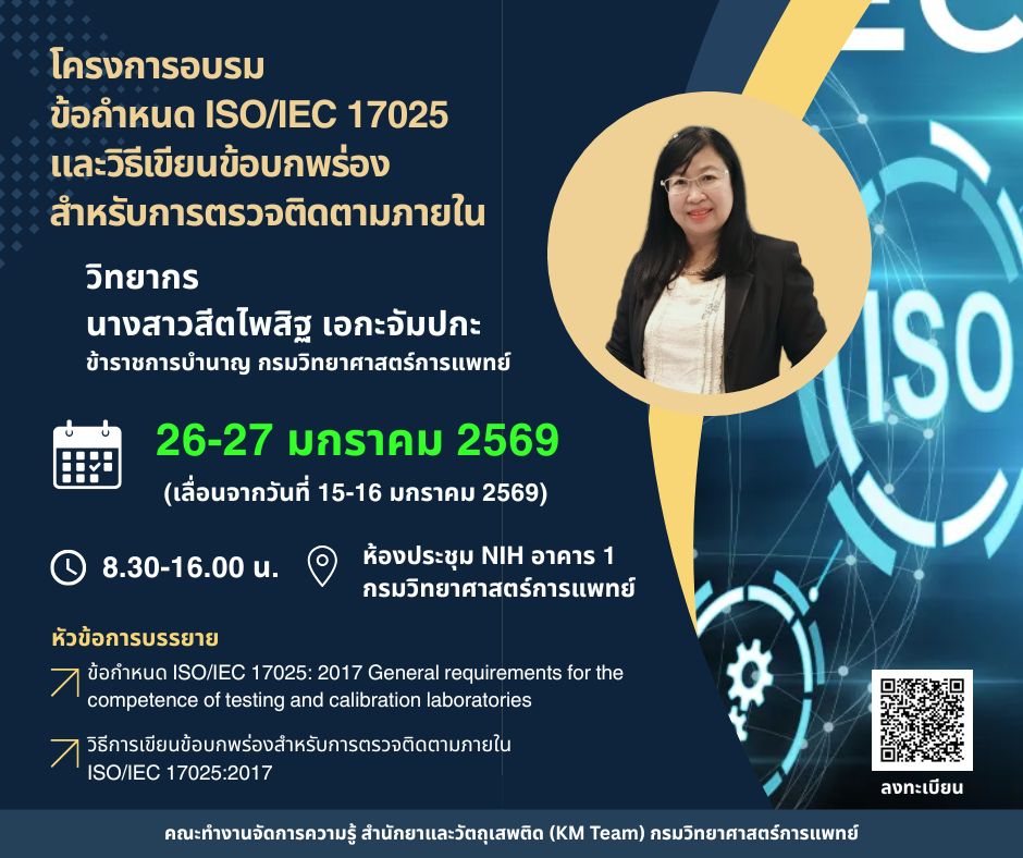 สำนักยาและวัตถุเสพติด กรมวิทยาศาสตร์การแพทย์ จัดโครงการอบรมเรื่อง “ข้อกำหนด ISO/IEC 17025:2017 และวิธีการเขียนข้อบกพร่องสำหรับการตรวจติดตามภายใน” ระหว่างวันที่ 26–27 มกราคม 2569 ณ ห้องประชุม NIH อาคาร 1 กรมวิทยาศาสตร์การแพทย์ โดยมี นางศิริวรรณ ชัยสมบูรณ์พันธ์ ผู้อำนวยการสำนักยาและวัตถุเสพติด เป็นประธานในพิธีเปิด
