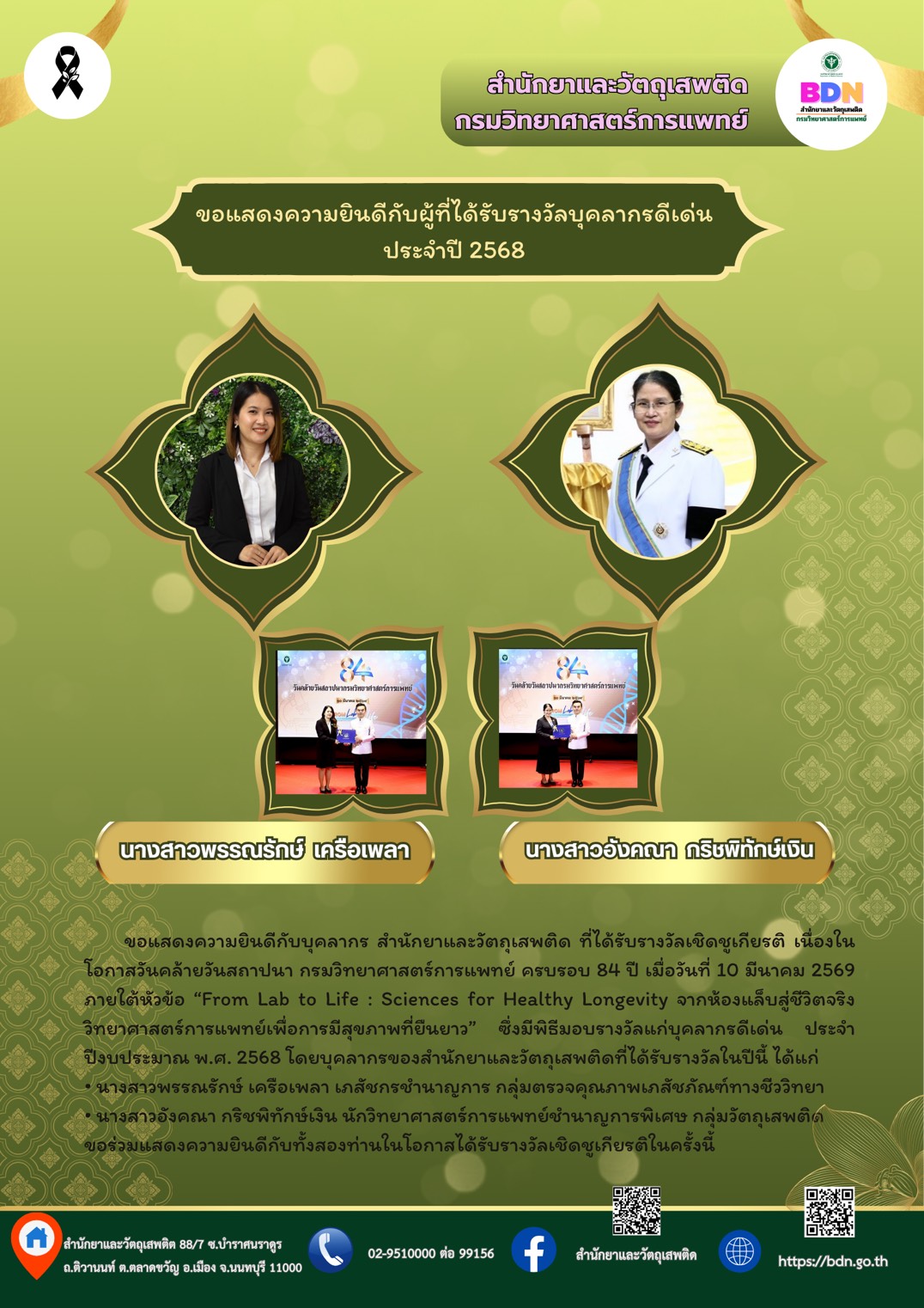 ขอแสดงความยินดีกับบุคลากร สำนักยาและวัตถุเสพติด ที่ได้รับรางวัลเชิดชูเกียรติ เนื่องในโอกาสวันคล้ายวันสถาปนา กรมวิทยาศาสตร์การแพทย์ ครบรอบ 84 ปี เมื่อวันที่ 10 มีนาคม 2569 ภายใต้หัวข้อ “From Lab to Life : Sciences for Healthy Longevity จากห้องแล็บสู่ชีวิตจริง วิทยาศาสตร์การแพทย์เพื่อการมีสุขภาพที่ยืนยาว” ซึ่งมีพิธีมอบรางวัลแก่บุคลากรดีเด่น ประจำปีงบประมาณ พ.ศ. 2568 โดยบุคลากรของสำนักยาและวัตถุเสพติดที่ได้รับรางวัลในปีนี้ ได้แก่