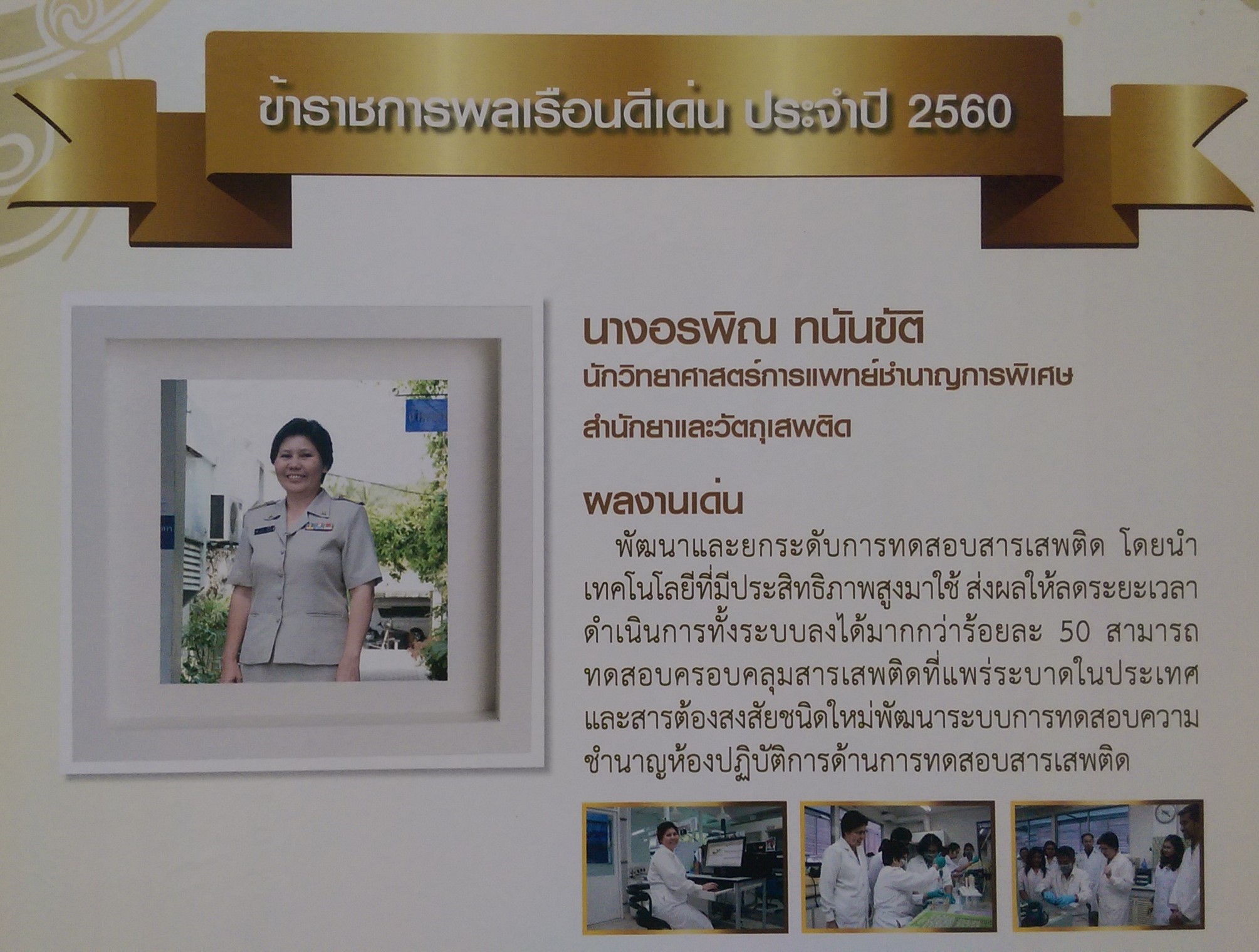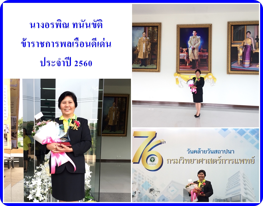 นางอรพิณ ทนันขัติ ได้รับรางวัลข้าราชการพลเรือนดีเด่น ปัจจุบันดำรงตำแหน่งนักวิทยาศาสตร์การแพทย์ชำนาญการพิเศษ และรองผู้อำนวยการสำนักยาและวัตถุเสพติด