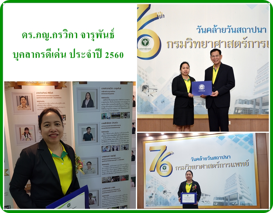 ในโอกาสเดียวกันนี้ กรมวิทยาศาสตร์การแพทย์ได้คัดเลือกและมอบประกาศนียบัตรแก่เจ้าหน้าที่ของกรมวิทยาศาสตร์การแพทย์ โดยเจ้าหน้าที่สำนักยาและวัตถุเสพติดได้รับรางวัล 2 ท่าน ได้แก่ นางอรพิณ ทนันขัติ (ข้าราชการพลเรือนดีเด่น) และ ดร.ภญ.กรวิกา จารุพันธ์ (บุคลากรดีเด่น)