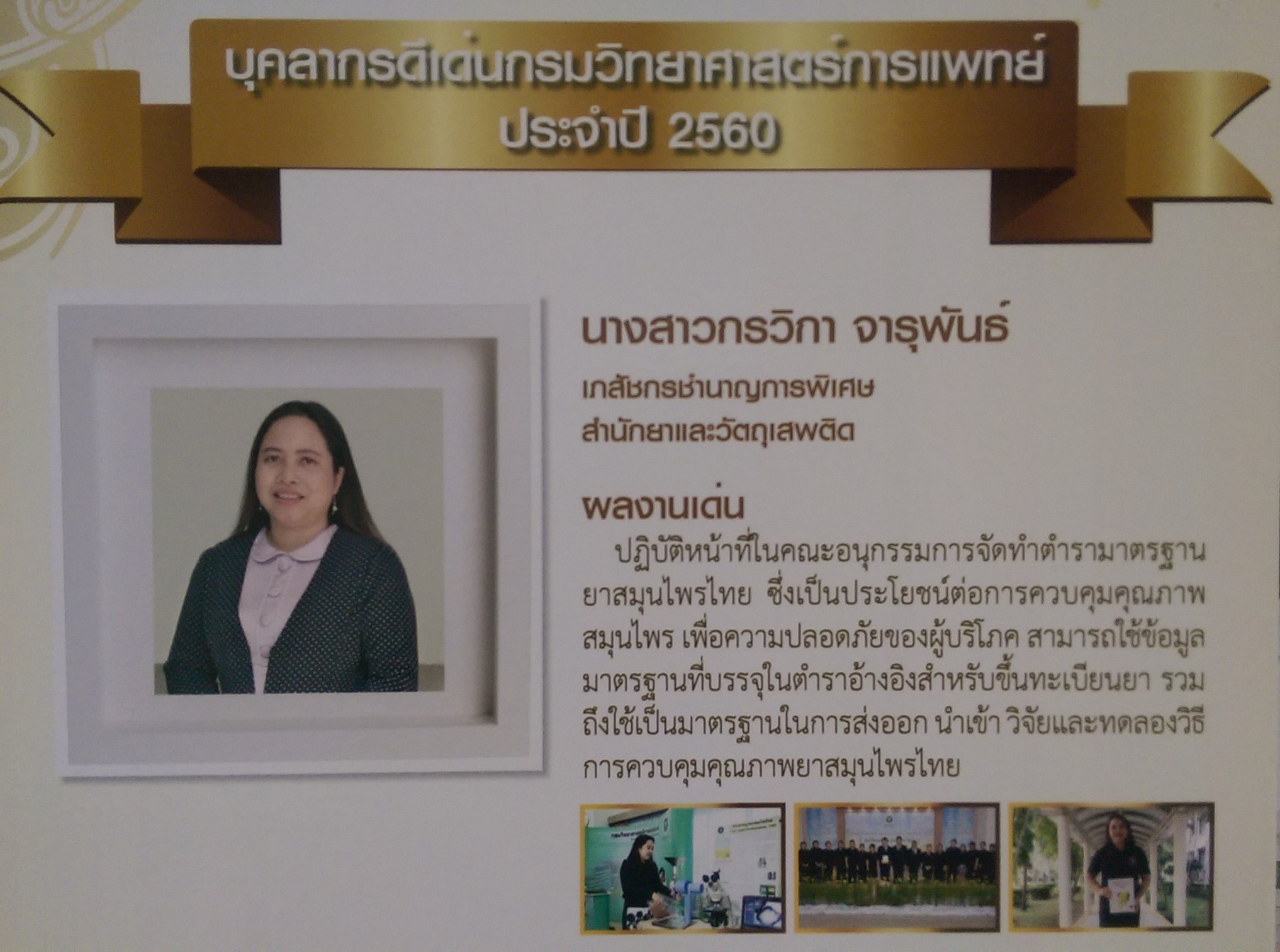 ดร.ภญ.กรวิกา จารุพันธ์ ได้รับรางวัลบุคลากรดีเด่น ปัจจุบันดำรงตำแหน่งเภสัชกรชำนาญการพิเศษ กลุ่มจัดทำตำรายาของประเทศไทย