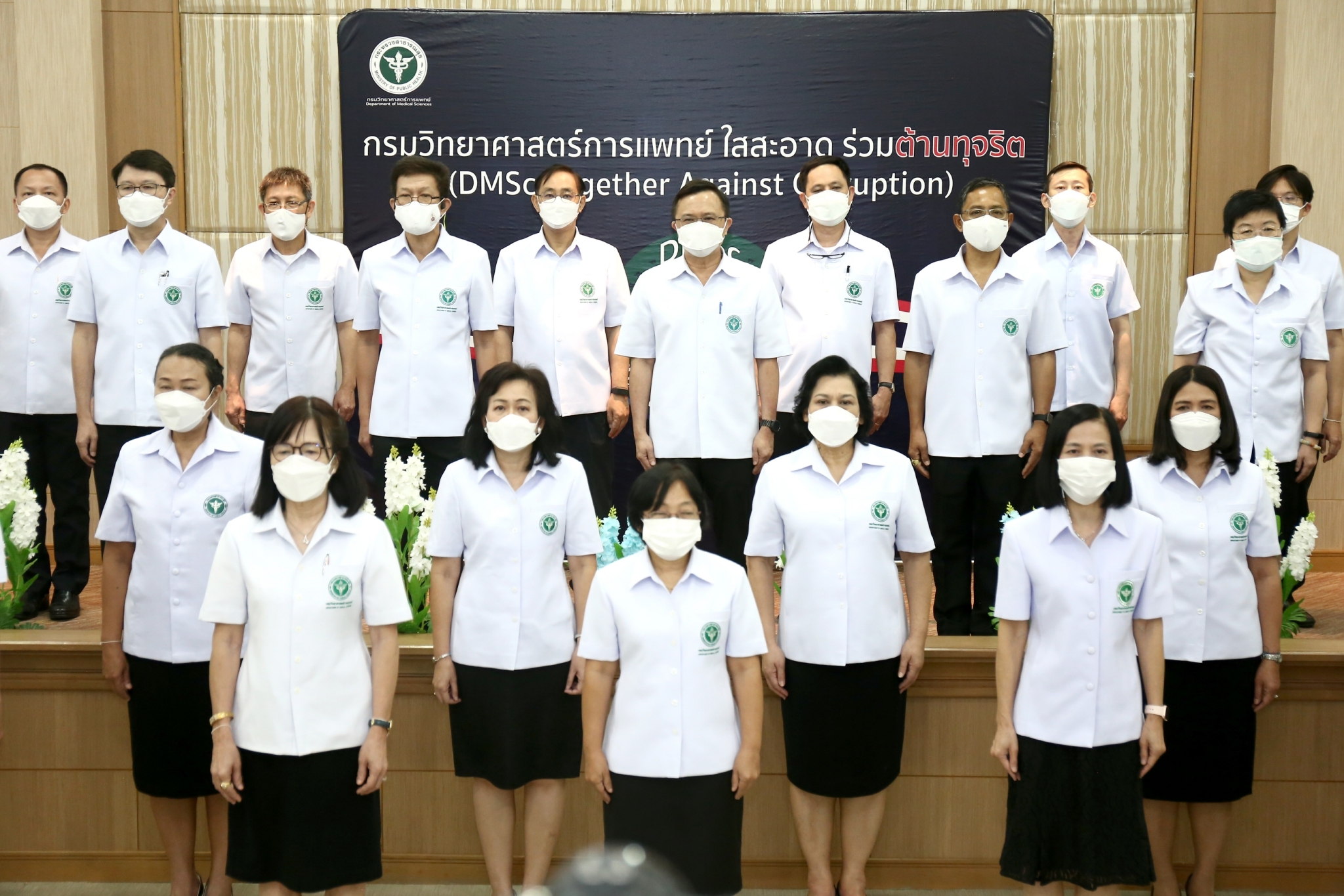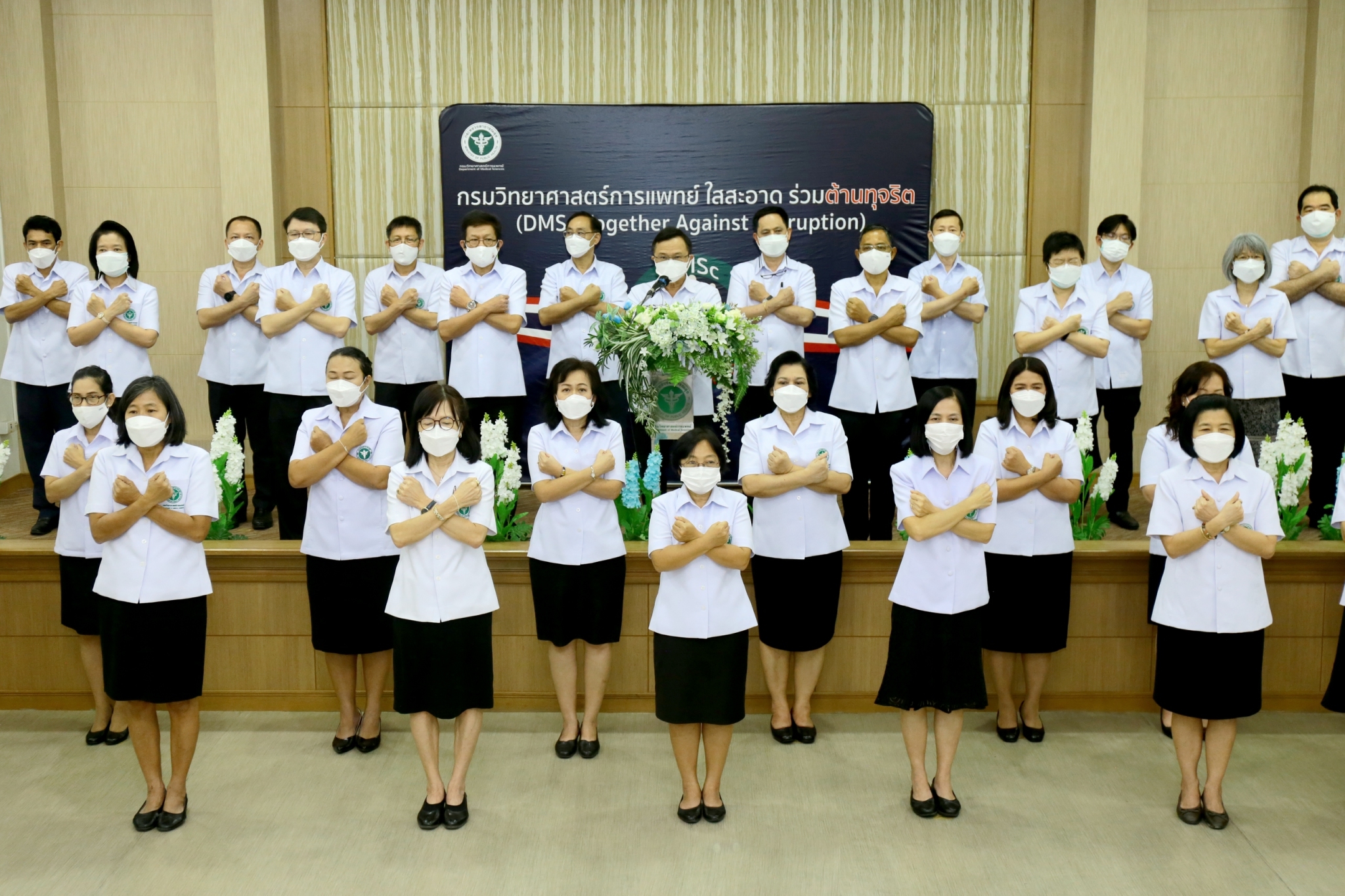 นายแพทย์ศุภกิจ ศิริลักษณ์ อธิบดีกรมวิทยาศาสตร์การแพทย์ พร้อมด้วยผู้บริหารของกรมวิทยาศาสตร์การแพทย์ ร่วมกันประกาศเจตนารมณ์ไม่ทนต่อการทุจริต “กรมวิทยาศาสตร์การแพทย์ใสสะอาด ร่วมต้านทุจริต” (DMSc Together Against Corruption )” ประจำปีงบประมาณ พ.ศ. ๒๕๖๕ เพื่อแสดงความมุ่งมั่น ไม่ทน ไม่ยอมรับ ไม่เพิกเฉยต่อการทุจริตทุกรูปแบบ เพื่อให้สาธารณชนรับรู้และเกิดความเชื่อมั่นต่อการปฏิบัติงานของ กรมวิทยาศาสตร์การแพทย์ด้วยคุณธรรมและความโปร่งใส ณ ห้องประชุม ๑๑๐ อาคาร ๑๐๐ ปีการสาธารณสุขไทย กรมวิทยาศาสตร์การแพทย์ จ.นนทบุรี วันที่ ๒๘ ธันวาคม พ.ศ. ๒๕๖๔