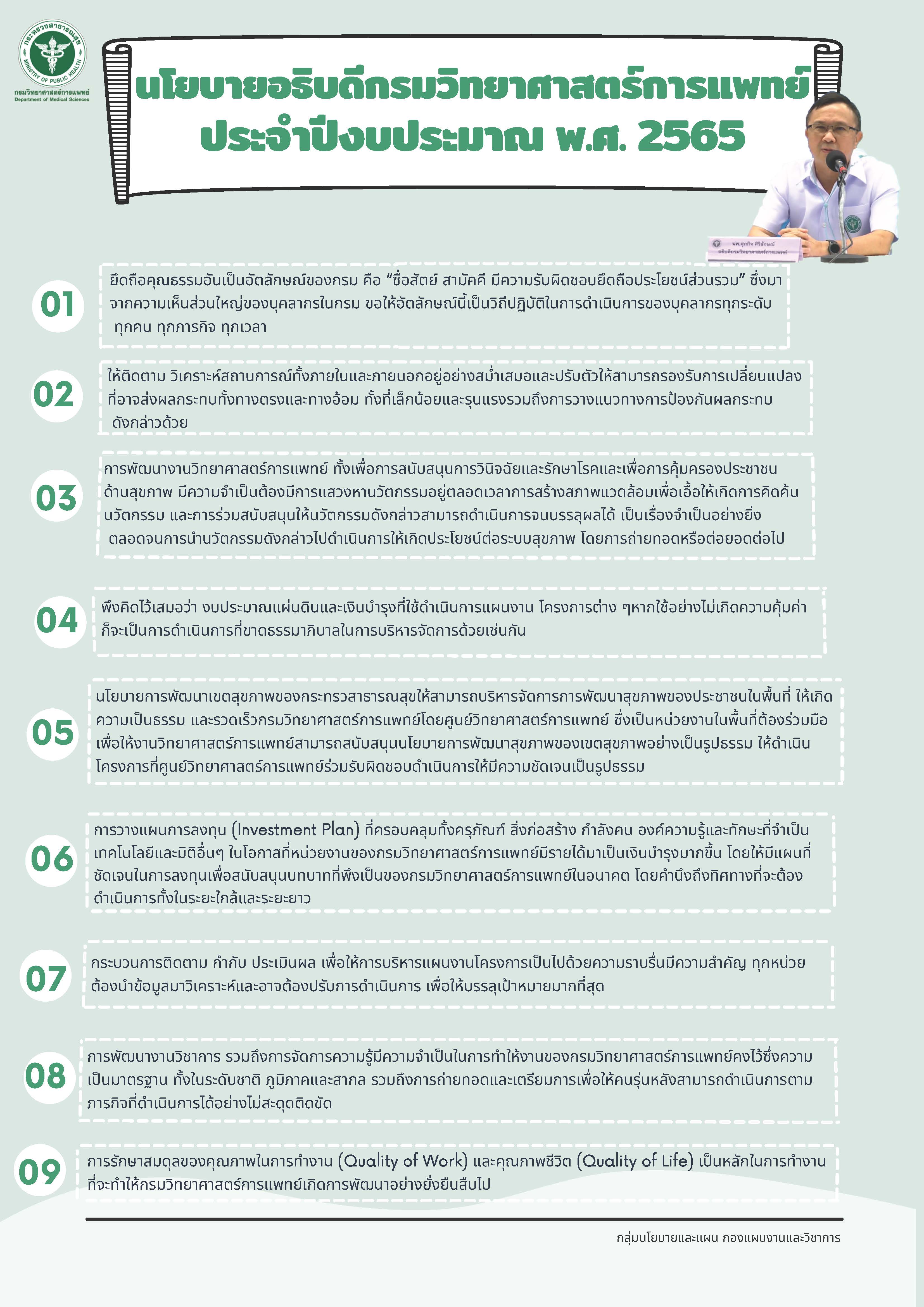 นโยบายอธิบดีกรมวิทยาศาสตร์การแพทย์ ปีงบประมาณ พ.ศ. ๒๕๖๕