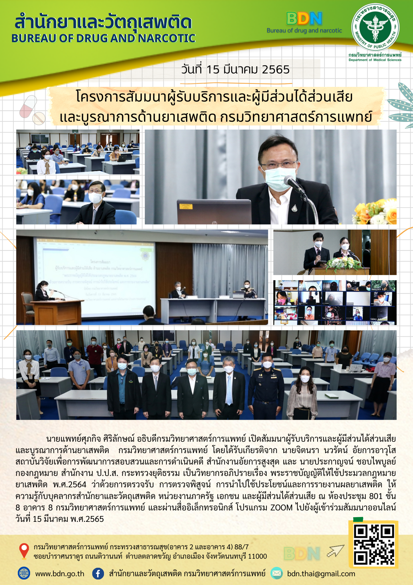 โดยได้รับเกียรติจาก นายจิตนรา นวรัตน์ อัยการอาวุโส สถาบันวิจัยเพื่อการพัฒนาการสอบสวนและการดำเนินคดี สำนักงานอัยการสูงสุด และนายประกาญจน์ ชอบไพบูลย์ กองกฎหมาย สำนักงาน ป.ป.ส. กระทรวงยุติธรรม เป็นวิทยากรอภิปรายเรื่อง พระราชบัญญัติให้ใช้ประมวลกฎหมายยาเสพติด พ.ศ. ๒๕๖๔ ว่าด้วยการตรวจรับ การตรวจพิสูจน์ การนำไปใช้ประโยชน์และการรายงานผลยาเสพติด ให้ความรู้กับบุคลากรสำนักยาและวัตถุเสพติด หน่วยงานภาครัฐ เอกชน และผู้มีส่วนได้ส่วนเสีย ณ ห้องประชุม ๘๐๑ ชั้น ๘ อาคาร ๘ กรมวิทยาศาสตร์การแพทย์ และผ่านสื่ออิเล็กทรอนิกส์ โปรแกรม zoom ไปยังผู้เข้าร่วมสัมมนาออนไลน์ วันที่ ๑๕ มีนาคม พ.ศ. ๒๕๖๕