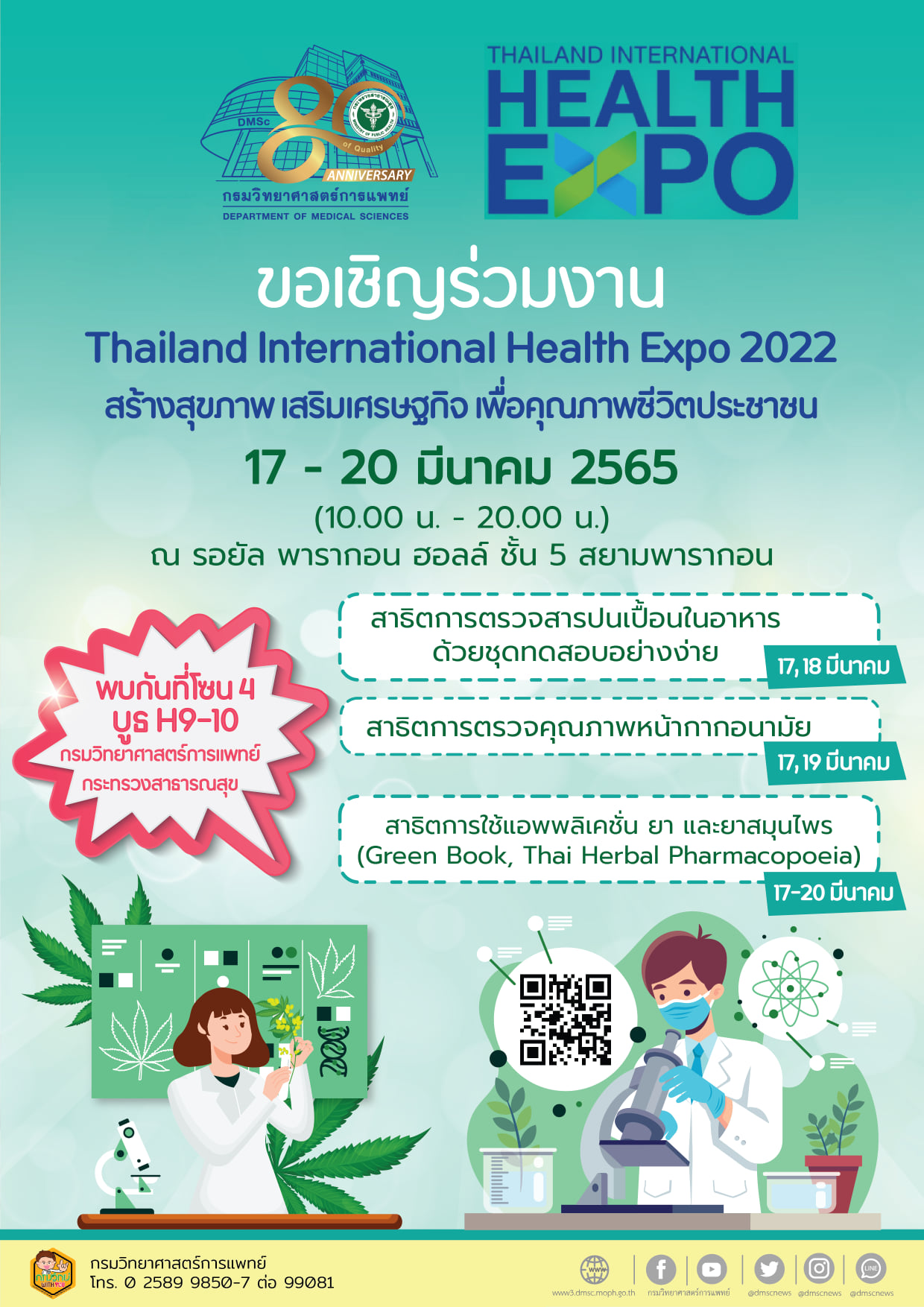 นายอนุทิน ชาญวีรกูล รองนายกรัฐมนตรีและรัฐมนตรีว่าการกระทรวงสาธารณสุข พร้อมด้วย ดร.สาธิต ปิตุเตชะ รัฐมนตรีช่วยว่าการกระทรวงสาธารณสุข และนายแพทย์เกียรติภูมิ วงศ์รจิต ปลัดกระทรวงสาธารณสุข เปิดงาน Thailand International Health Expo 2022 ภายใต้แนวคิด “สร้างสุขภาพ เสริมเศรษฐกิจ เพื่อคุณภาพชีวิตประชาชน” ในรูปแบบ Hybrid Expo แสดงศักยภาพด้านการแพทย์และสาธารณสุขไทย ผลักดันธุรกิจสุขภาพสู่เวทีโลก สร้างมูลค่าทางเศรษฐกิจ พร้อมก้าวสู่การเป็นศูนย์กลางการท่องเที่ยวและการดูแลสุขภาพของโลก โดย กรมวิทยาศาสตร์การแพทย์ ร่วมจัดนิทรรศการให้ความรู้ด้านวิทยาศาสตร์การแพทย์และห้องปฏิบัติการงานสาธารณสุขและคุ้มครองผู้บริโภค ด้านยา อาหาร รังสีและเครื่องมือแพทย์ ฯลฯ โดยมี นายแพทย์ปิยะ ศิริลักษณ์ รองอธิบดีกรมวิทยาศาสตร์การแพทย์ พร้อมด้วย ดร.ภญ.ประไพ วงศ์สินคงมั่น หัวหน้าสำนักวิชาการวิทยาศาสตร์การแพทย์ นางเลขา ปราสาททอง ผู้อำนวยการสำนักคุณภาพและความปลอดภัยอาหาร ภก.สมศักดิ์ สุนทรพาณิชย์ ผู้อำนวยการสำนักยาและวัตถุเสพติด ร่วมเป็นเกียรติในพิธีเปิดที่รอยัล พารากอน ฮอลล์ ชั้น 5 สยามพารากอนวันที่ 17 มีนาคม พ.ศ. 2565