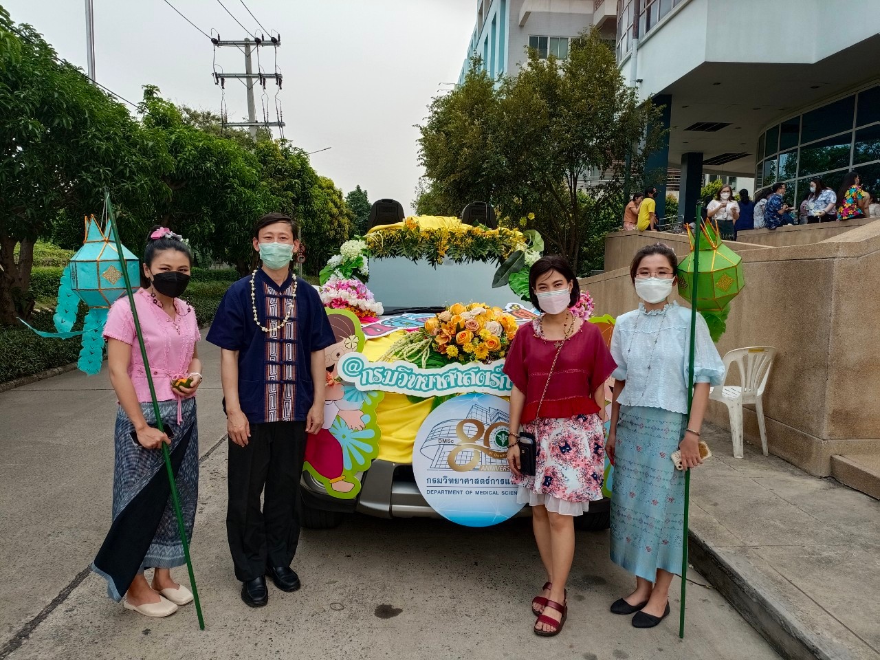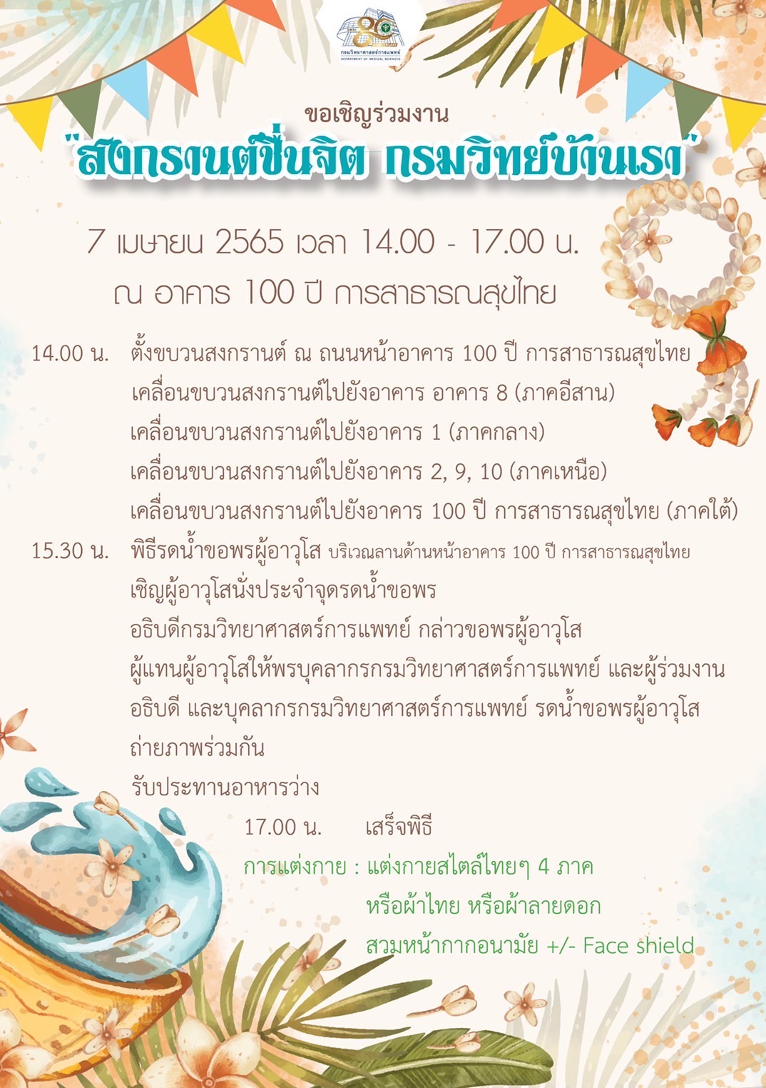 กรมวิทยาศาสตร์การแพทย์ จัดพิธีรดน้ำขอพรเนื่องในวันสงกรานต์ “สงกรานต์ชื่นจิต กรมวิทย์ฯ บ้านเรา” ขบวนแห่พระพุทธรูป ไปยังอาคารต่างๆ แนวคิดแต่งกายสไตล์ไทยๆ ๔ ภาค เพื่อสืบสานประเพณีวันขึ้นปีใหม่ของไทยที่มีมาแต่โบราณอันงดงาม อ่อนโยน เอื้ออาทร และเต็มไปด้วยบรรยากาศความกตัญญู ความอบอุ่น และให้เกียรติเคารพซึ่งกันและกัน โดยมี นายแพทย์ศุภกิจ ศิริลักษณ์ อธิบดีกรมวิทยาศาสตร์การแพทย์ นายแพทย์บัลลังก์ อุปพงษ์ รองอธิบดีกรมวิทยาศาสตร์การแพทย์ และ นายแพทย์ปิยะ ศิริลักษณ์ รองอธิบดีกรมวิทยาศาสตร์การแพทย์ ผู้บริหาร และบุคลากรกรมวิทยาศาสตร์การแพทย์ เข้าร่วมพิธี ณ อาคาร ๑๐๐ ปีการสาธารณสุขไทย กรมวิทยาศาสตร์การแพทย์ โดยกิจกรรมครั้งนี้มีการปฏิบัติตามมาตรการป้องกันการแพร่ระบาดของไวรัสโควิด-19 วันที่ ๗ เมษายน พ.ศ. ๒๕๖๕