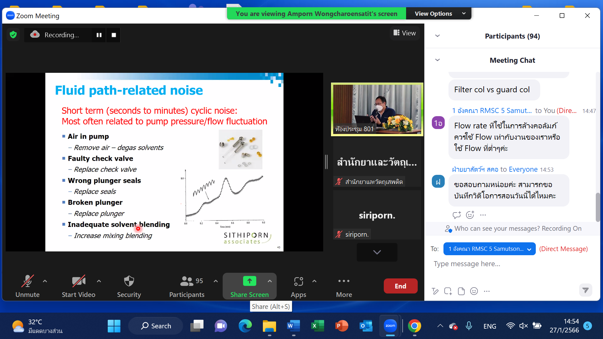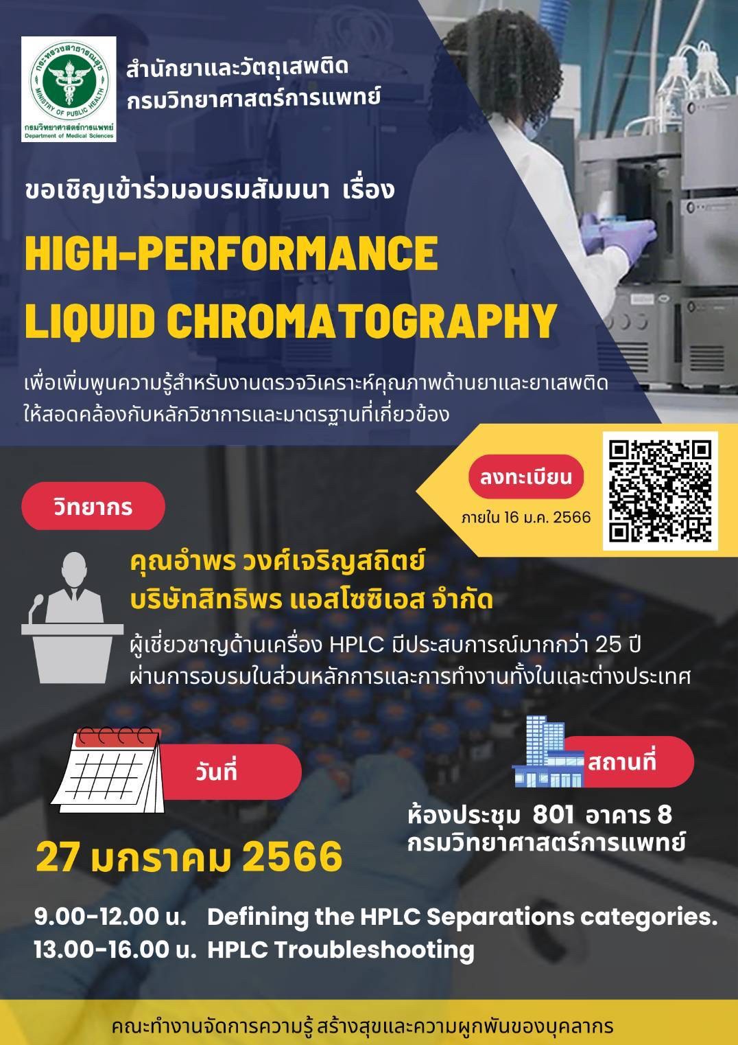 คณะทำงานจัดการความรู้ สร้างสุขและความผูกพันของบุคลากรสำนักยาและวัตถุเสพติด ได้จัดอบรมเรื่อง เครื่อง HPLC และการแก้ปัญหาเบื้องต้น โดยมีวัตถุประสงค์เพื่อให้นักวิเคราะห์ทั้งภายในและภายนอกหน่วยงาน ได้รับการพัฒนางานด้านการตรวจวิเคราะห์ยาและยาเสพติด และสามารถปฏิบัติงานให้สอดคล้องกับหลักวิชาการและได้ผลการวิเคราะห์ที่เที่ยงตรง แม่นยำ และจากผลสำรวจความต้องการฝึกอบรมของหน่วยงาน พบว่าประเภทหัวข้อการอบรมที่ได้รับคะแนนสูงที่สุด คือ “การใช้และบำรุงรักษาเครื่องมือ/อุปกรณ์” ดังนั้น ทางคณะทำงานจัดการความรู้ฯ จึงได้จัดการอบรมหัวข้อนี้ทั้งทาง onsite และ online ผ่านระบบ Application Zoom meeting เมื่อวันที่ 27 มกราคม 2566 ณ ห้องประชุม 801 อาคาร8 กรมวิทยาศาสตร์การแพทย์ โดยได้รับเกียรติ์จากวิทยากรผู้เชี่ยวชาญของบริษัท สิทธิพร แอสโซซิเอส จำกัด คุณอำพร วงศ์เจริญสถิตย์ มาบรรยายในหัวข้อ