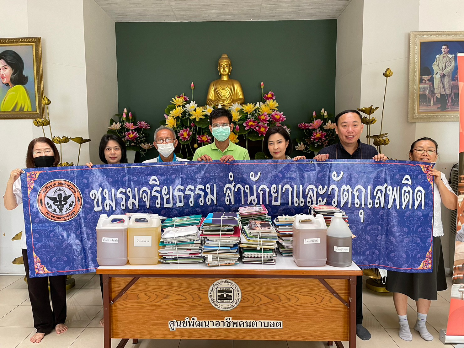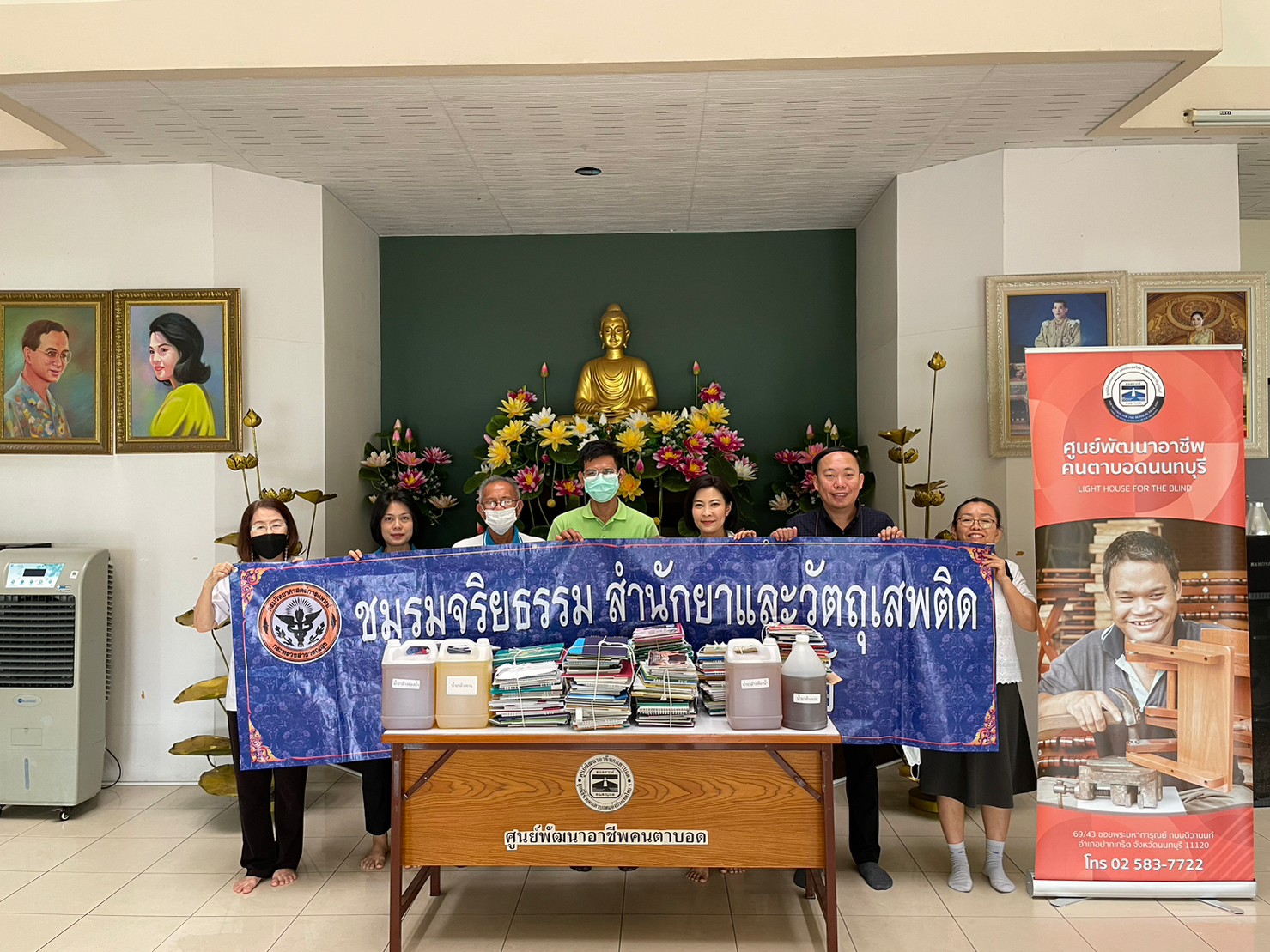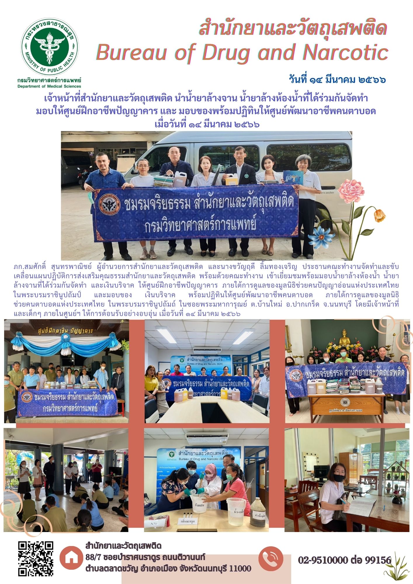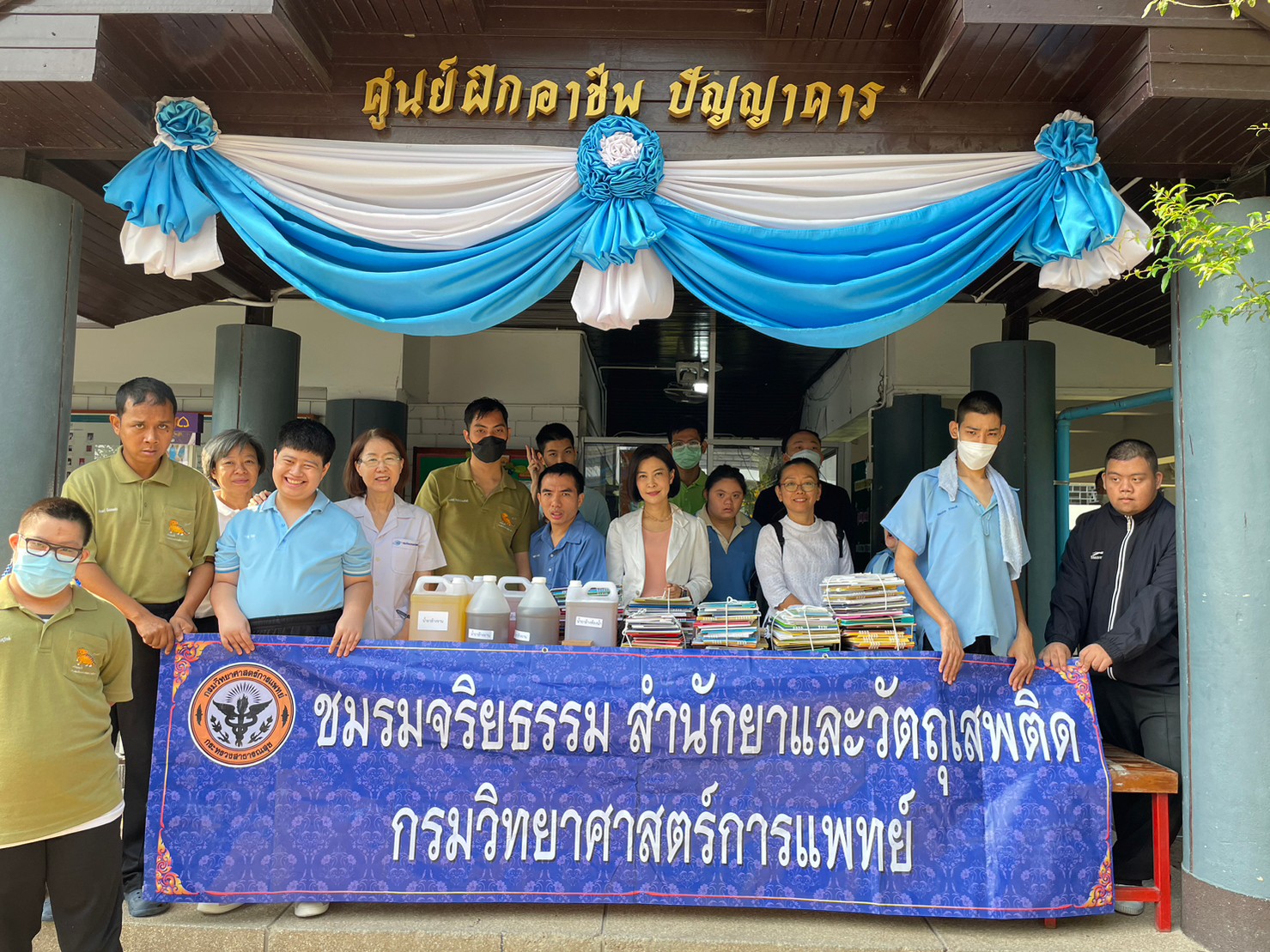 ภก.สมศักดิ์ สุนทรพาณิชย์ ผู้อำนวยการสำนักยาและวัตถุเสพติด พร้อมด้วยตัวแทนคณะทำงานจัดทำและขับเคลื่อนแผนปฏิบัติการส่งเสริมคุณธรรม สำนักยาและวัตถุเสพติด เข้าเยี่ยมชมพร้อมมอบน้ำยาล้างห้องน้ำ น้ำยาล้างจานที่ได้ร่วมกันจัดทำ และเงินบริจาค ให้ศูนย์ฝึกอาชีพปัญญาคาร ภายใต้การดูแลของมูลนิธิช่วยคนปัญญาอ่อนแห่งประเทศไทย ในพระบรมราชินูปถัมป์ และมอบของ เงินบริจาค พร้อมปฏิทินให้ศูนย์พัฒนาอาชีพคนตาบอด ภายใต้การดูแลของมูลนิธิช่วยคนตาบอดแห่งประเทศไทย ในพระบรมราชินูปถัมถ์ โดยมีเจ้าหน้าที่และเด็กๆ ภายในศูนย์ฯ ให้การต้อนรับอย่างอบอุ่น เมื่อวันที่ ๑๔ มีนาคม ๒๕๖๖