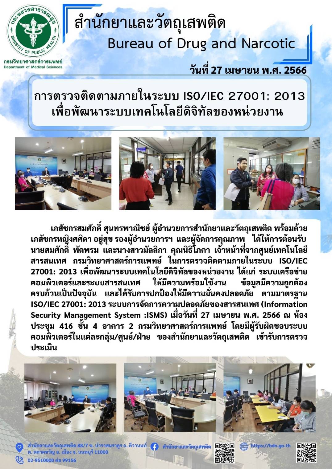 เภสัชกรสมศักดิ์ สุนทรพาณิชย์ ผู้อำนวยการสำนักยาและวัตถุเสพติด พร้อมด้วย เภสัชกรหญิงศศิดา อยู่สุข รองผู้อำนวยการฯ และผู้จัดการคุณภาพ ได้ให้การต้อนรับ นายสมศักดิ์ พัดพรม และนางสาวมัลลิกา คุณนิธิโภคา เจ้าหน้าที่จากศูนย์เทคโนโลยีสารสนเทศ กรมวิทยาศาสตร์การแพทย์ ในการตรวจติดตามภายในระบบ ISO/IEC 27001: 2013 เพื่อพัฒนาระบบเทคโนโลยีดิจิทัลของหน่วยงาน ได้แก่ ระบบเครือข่ายคอมพิวเตอร์และระบบสารสนเทศ ให้มีความพร้อมใช้งาน ข้อมูลมีความถูกต้อง ครบถ้วนเป็นปัจจุบัน และได้รับการปกป้องให้มีความมั่นคงปลอดภัย ตามมาตรฐาน ISO/IEC 27001 : 2013 ระบบการจัดการความปลอดภัยของสารสนเทศ (Information Security Management System :ISMS) เมื่อวันที่ 27 เมษายน พ.ศ. 2566 ณ ห้องประชุม 476 ชั้น 4 อาคาร 2 กรมวิทยาศาสตร์การแพทย์ โดยมีผู้รับผิดชอบระบบคอมพิวเตอร์ในแต่ละกลุ่ม/ศูนย์/ฝ่าย ของสำนักยาและวัตถุเสพติด เข้ารับการตรวจประเมิน