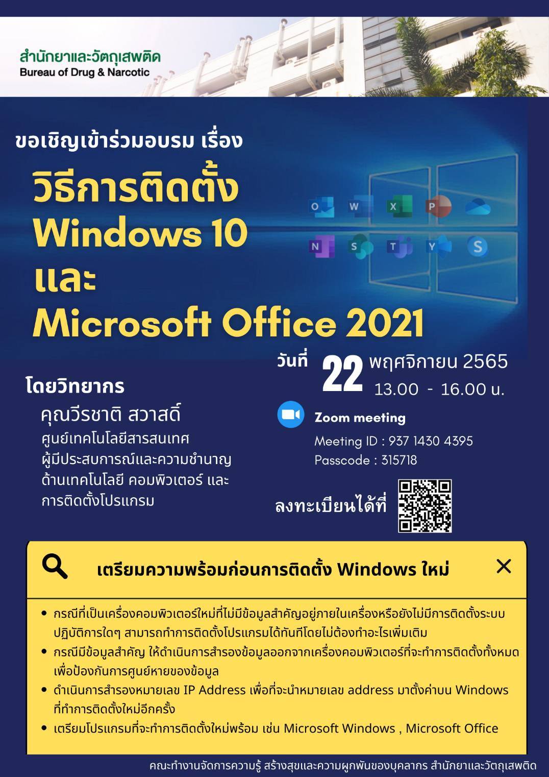 คณะทำงานจัดการความรู้ สร้างสุขและความผูกพันของบุคลากรสำนักยาและวัตถุเสพติด ได้จัดอบรมเรื่อง วิธีติดตั้ง Windows 10 และ Microsoft office 2021 โดยมีวัตถุประสงค์เพื่อให้เจ้าหน้าที่สามารถนำ ICT (Information and Communication Technology) หรือ เทคโนโลยีสารสนเทศ ข้อมูล และการสื่อสาร มาประยุกต์ใช้ในการปฏิบัติงาน เพื่อตอบสนองนโยบายกรม Digital Transformation ในการใช้ประโยชน์จากเทคโนโลยีดิจิทัลได้อย่างเต็มศักยภาพ และสอดคล้องตามระบบคุณภาพ ISO/IEC 27001:2013 ดังนั้น ทางคณะทำงานจัดการความรู้ฯ จึงได้จัดการอบรมหัวข้อนี้ทั้งทาง onsite และ online ผ่านระบบ Application Zoom meeting เมื่อวันที่ 22 พฤศจิกายน 2565 ณ ห้องประชุมศูนย์สารมาตรฐาน ชั้น3 อาคาร2 กรมวิทยาศาสตร์การแพทย์ โดยได้รับเกียรติ์วิทยากร จากศูนย์เทคโนโลยีสารสนเทศ คุณนายวีรชาติ สวาสดิ์ มาบรรยายในหัวข้อ "วิธีการติดตั้ง Windows 10 และ Microsoft Office 2021"