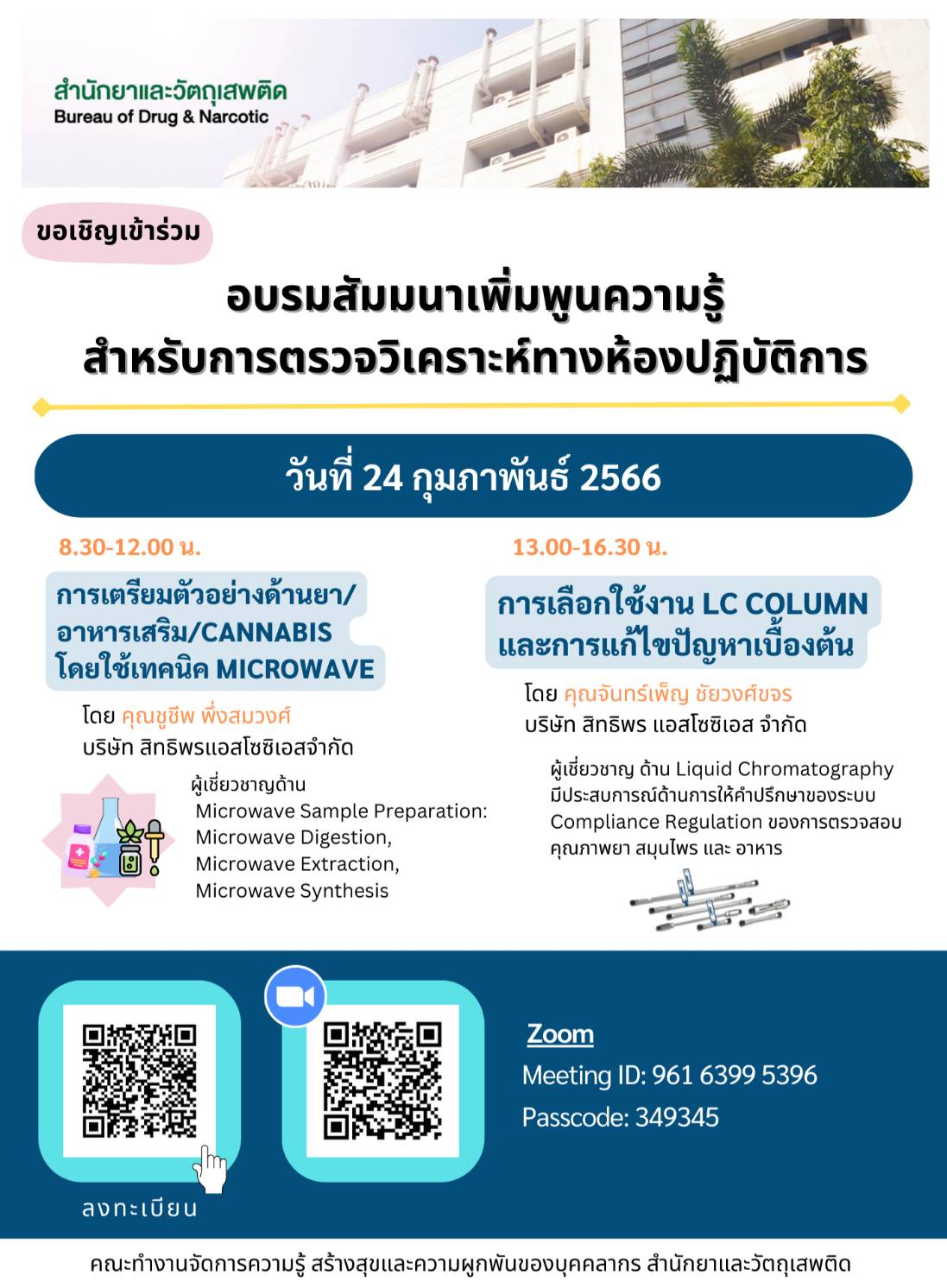 คณะทำงานจัดการความรู้ สร้างสุขและความผูกพันของบุคลากรสำนักยาและวัตถุเสพติด ได้จัดอบรมเรื่อง การเลือกใช้งาน LC คอลัมน์และการแก้ปัญหาเบื้องต้น และการเตรียมตัวอย่างด้านยา / อาหารเสริม / Cannabis โดยใช้เทคนิค Microwave โดยมีวัตถุประสงค์เพื่อให้นักวิเคราะห์ทั้งภายในและภายนอกหน่วยงาน ได้รับการพัฒนางานด้านการตรวจวิเคราะห์ยาและยาเสพติด และสามารถปฏิบัติงานให้สอดคล้องกับหลักวิชาการและได้ผลการวิเคราะห์ที่เที่ยงตรง แม่นยำ ดังนั้น ทางคณะทำงานจัดการความรู้ฯ จึงได้จัดการอบรมหัวข้อนี้ทั้งทาง onsite และ online ผ่านระบบ Application Zoom meeting เมื่อวันที่ 24 กุมภาพันธ์ 2566 ณ ห้องประชุม 110 อาคาร 14 (100ปี การสาธารณสุขไทย) กรมวิทยาศาสตร์การแพทย์ โดยได้รับเกียรติ์จากวิทยากรผู้เชี่ยวชาญของบริษัท สิทธิพร แอสโซซิเอส จำกัด คุณชูชีพ พึ่งสมวงศ์ และคุณจันทร์เพ็ญ ชัยวงศ์ขจร มาบรรยายในหัวข้อ