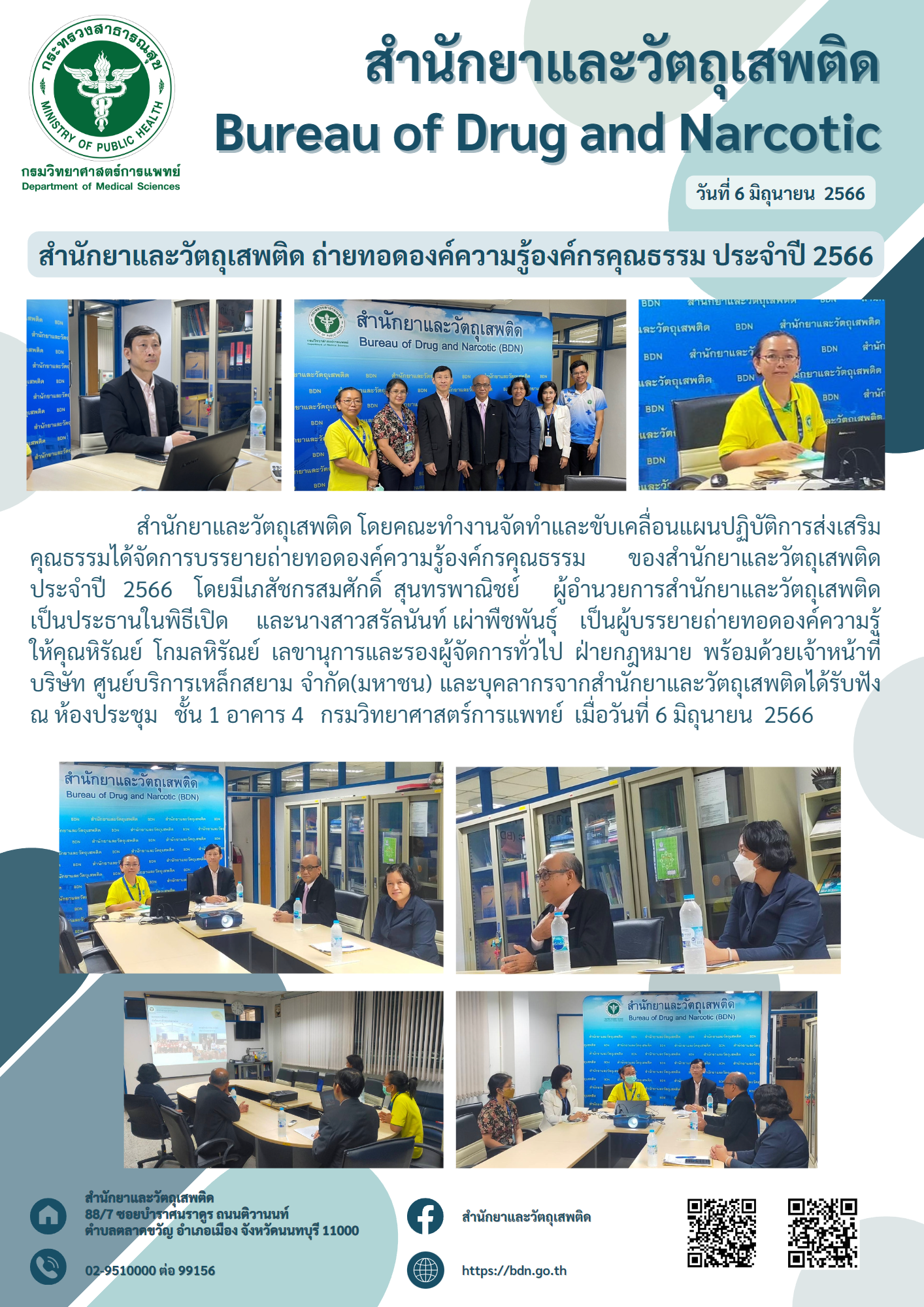 สำนักยาและวัตถุเสพติด โดยคณะทำงานจัดทำและขับเคลื่อนแผนปฏิบัติการส่งเสริมคุณธรรม ได้จัดการบรรยายถ่ายทอดองค์ความรู้องค์กรคุณธรรมของสำนักยาและวัตถุเสพติด ประจำปี ๒๕๖๖ โดยมีเภสัชกรสมศักดิ์ สุนทรพาณิชย์ ผู้อำนวยการสำนักยาและวัตถุเสพติด เป็นประธานในพิธีเปิด และนางสาวสรัลนันท์ เผ่าพืชพันธุ์  เป็นผู้บรรยายถ่ายทอดองค์ความรู้ ให้คุณหิรัณย์ โกมลหิรัณย์ เลขานุการและรองผู้จัดการทั่วไป ฝ่ายกฎหมาย พร้อมด้วยเจ้าหน้าที่บริษัท ศูนย์บริการเหล็กสยาม จำกัด (มหาชน) จ. สมุทรปราการ และบุคลากรจากสำนักยาและวัตถุเสพติด ได้รับฟัง ณ ห้องประชุมชั้น ๑ อาคาร ๔ กรมวิทยาศาสตร์การแพทย์ เมื่อวันที่ ๖ มิถุนายน  ๒๕๖๖