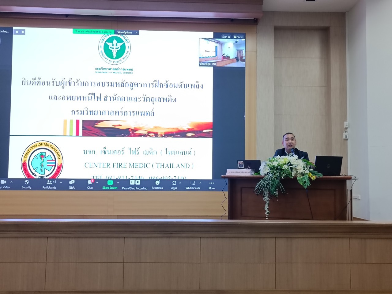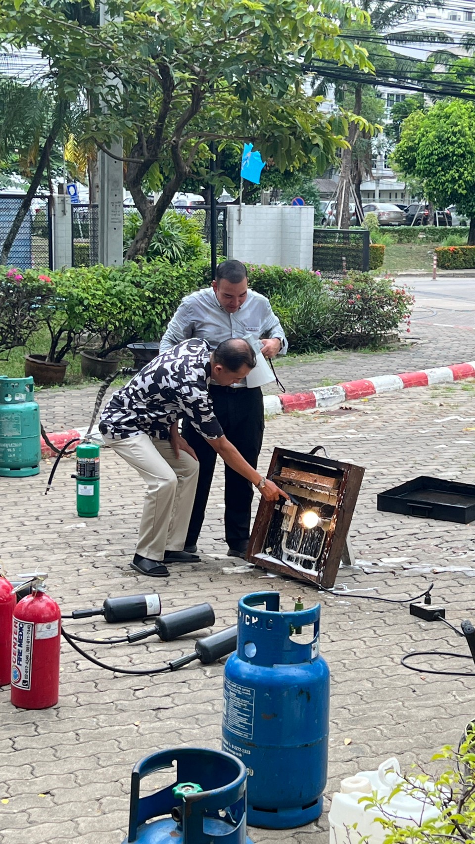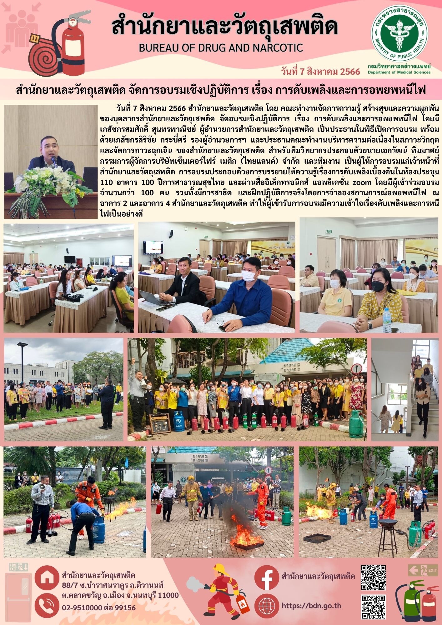 วันที่ ๗ สิงหาคม ๒๕๖๖ สำนักยาและวัตถุเสพติด โดย คณะทำงานจัดการความรู้ สร้างสุขและความผูกพันของบุคลากรสำนักยาและวัตถุเสพติด จัดอบรมเชิงปฏิบัติการ เรื่อง การดับเพลิงและการอพยพหนีไฟ โดยมีเภสัชกรสมศักดิ์ สุนทรพาณิชย์ ผู้อำนวยการสำนักยาและวัตถุเสพติด เป็นประธานในพิธีเปิดการอบรม พร้อมด้วยเภสัชกรสิริชัย กระบี่ศรี รองผู้อำนวยการฯ และประธานคณะทำงานบริหารความต่อเนื่องในสภาวะวิกฤตและจัดการภาวะฉุกเฉิน ของสำนักยาและวัตถุเสพติด สำหรับทีมวิทยากรประกอบด้วยนายเอกวัฒน์ ทิมมาศย์ กรรมการผู้จัดการบริษัทเซ็นเตอร์ไฟร์ เมดิก (ไทยแลนด์) จำกัด และทีมงาน เป็นผู้ให้การอบรมแก่เจ้าหน้าที่สำนักยาและวัตถุเสพติด การอบรมประกอบด้วยการบรรยายให้ความรู้เรื่องการดับเพลิงเบื้องต้นในห้องประชุม ๑๑๐ อาคาร ๑๐๐ ปีการสาธารณสุขไทย และผ่านสื่ออิเล็กทรอนิกส์ แอพลิเคชั่น zoom โดยมีผู้เข้าร่วมอบรมจำนวนกว่า ๑๐๐ คน รวมทั้งมีการสาธิต และฝึกปฏิบัติการจริงโดยการจำลองสถานการณ์อพยพหนีไฟ ณ อาคาร ๒ และอาคาร ๔ สำนักยาและวัตถุเสพติด ทำให้ผู้เข้ารับการอบรมมีความเข้าใจเรื่องดับเพลิงและการหนีไฟเป็นอย่างดี