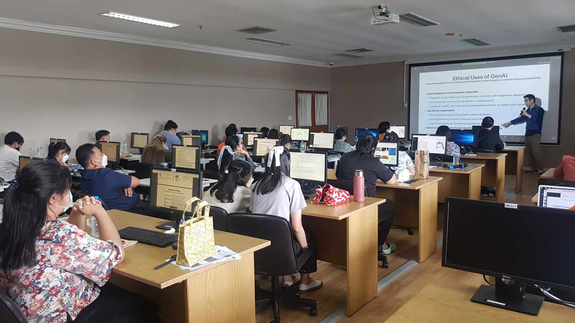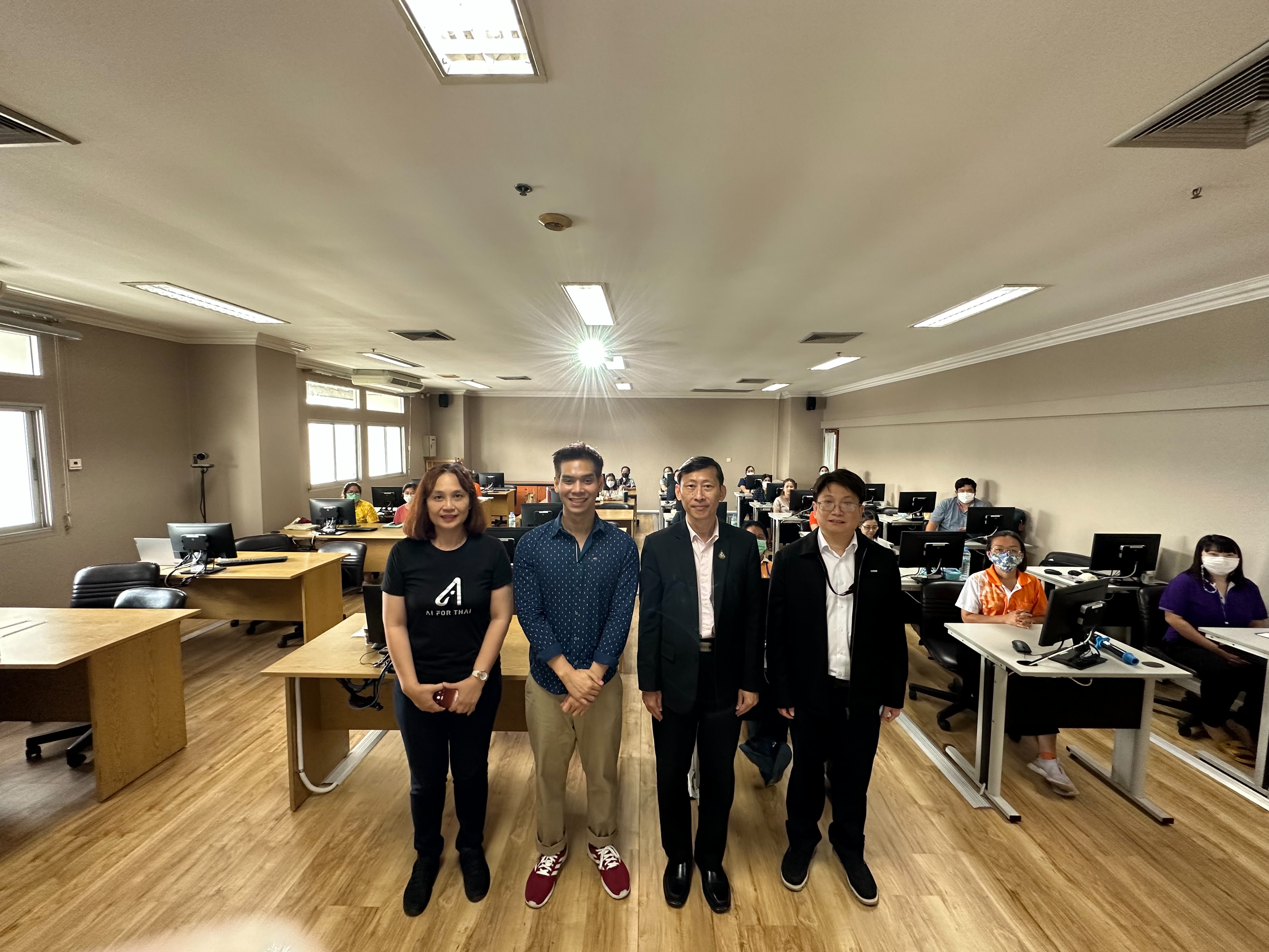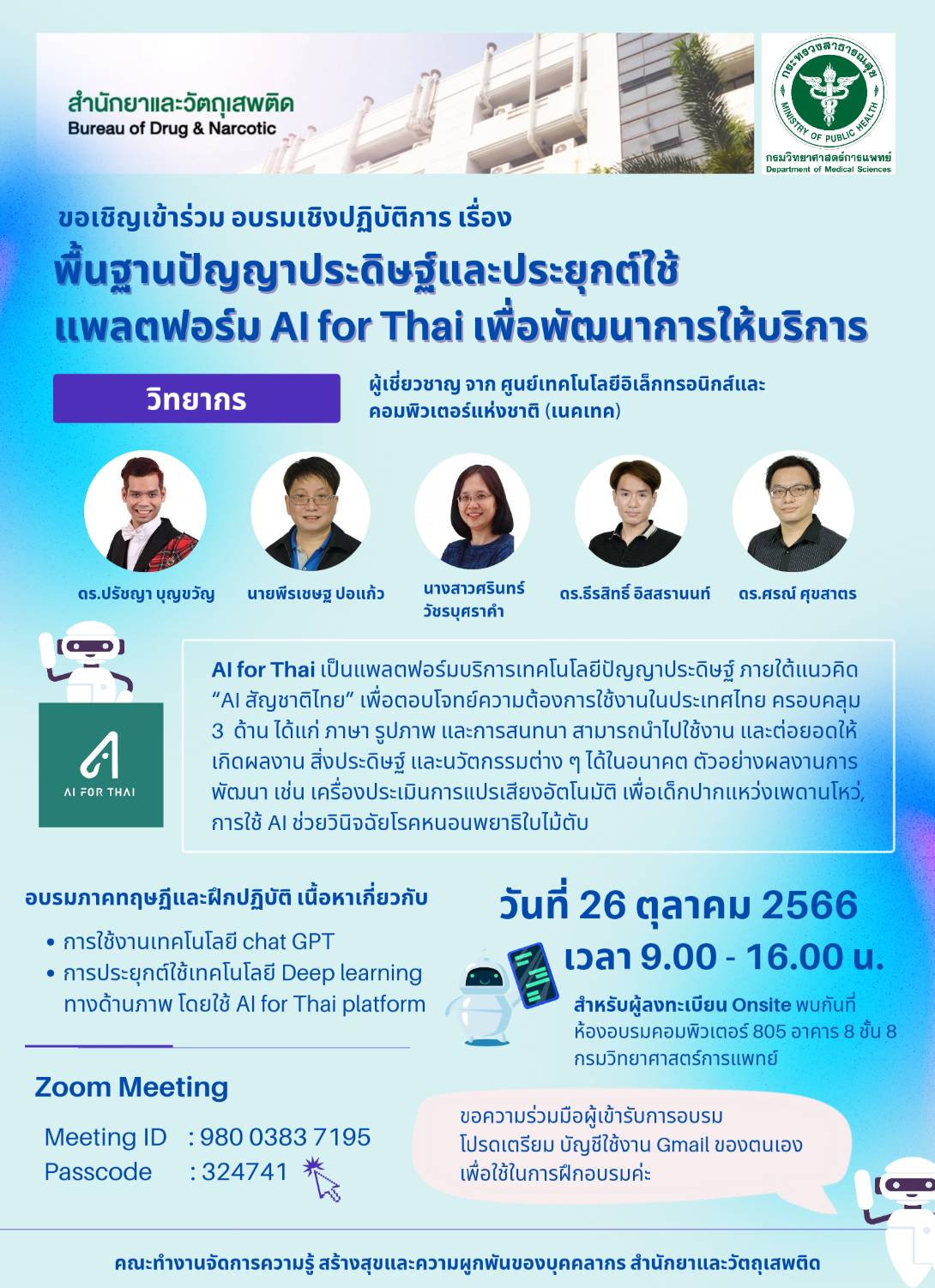 คณะทำงานจัดการความรู้ สร้างสุขและความผูกพันของบุคลากรสำนักยาและวัตถุเสพติด ได้จัดอบรมเชิงปฏิบัติการ เรื่อง "พื้นฐานปัญญาประดิษฐ์และประยุกต์ใช้แพลตฟอร์ม AI for Thai เพื่อพัฒนาการให้บริการ" โดยมีวัตถุประสงค์เพื่อให้บุคลากรสำนักยาและวัตถุเสพติดและบุคลากรที่สนใจ สามารถนำ AI (Artificial intelligence) หรือปัญญาประดิษฐ์ มาประยุกต์ใช้ในการปฏิบัติงาน เพื่อตอบสนองนโยบายกรม Digital Transformation ในการใช้ประโยชน์จากเทคโนโลยีดิจิทัลได้อย่างเต็มศักยภาพ โดย AI จะช่วยให้การตัดสินใจสิ่งที่ซับซ้อนทำได้ง่ายขึ้น ด้วยข้อมูลที่มาจากการประมวลผลข้อมูลขนาดใหญ่ของ AI ที่ช่วยให้เข้าใจได้ง่ายมากยิ่งขึ้น เกิดความสะดวก ประหยัดเวลาและทรัพยากร ช่วยลดข้อผิดพลาด และลดการทำงานซ้ำๆ ทำให้ผลการปฏิบัติงานมีความถูกต้องและมีประสิทธิภาพมากขึ้น รวมทั้งการนำไปสู่การพัฒนาคุณภาพการให้บริการแก่ประชาชนได้ ดังนั้น ทางคณะทำงานจัดการความรู้ฯ จึงได้จัดการอบรมหัวข้อนี้เมื่อวันที่ 26 ตุลาคม 2566 ณ ห้องอบรมคอมพิวเตอร์ 805 ชั้น8 อาคาร8 กรมวิทยาศาสตร์การแพทย์ โดยได้รับเกียรติ์ทีมวิทยากร นักวิจัยจากทีมวิจัยเทคโนโลยีภาษาธรรมชาติและความหมาย กลุ่มวิจัยปัญญาประดิษฐ์ ศูนย์เทคโนโลยีอิเล็กทรอนิกส์และคอมพิวเตอร์แห่งชาติ (National Electronics and Computer Technology Center : NECTEC หรือเนคเทค) โดยมีหัวข้อการบรรยายดังนี้