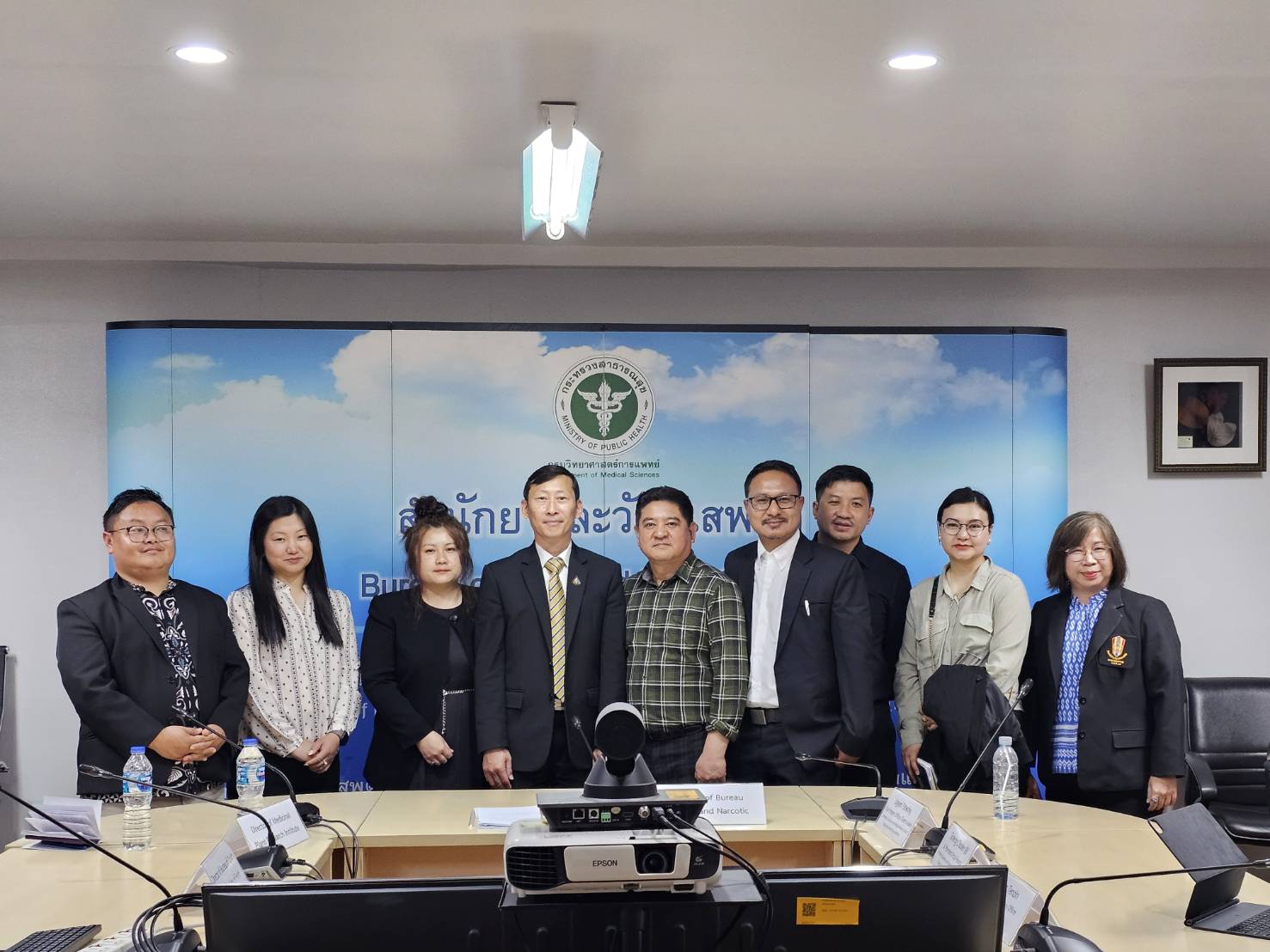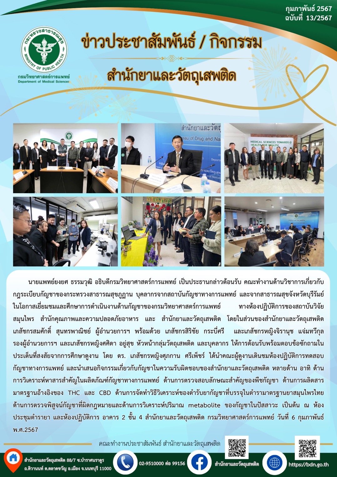 นายแพทย์ยงยศ ธรรมวุฒิ อธิบดีกรมวิทยาศาสตร์การแพทย์ เป็นประธานกล่าวต้อนรับ คณะทำงานด้านวิชาการเกี่ยวกับกฎระเบียบกัญชาของกระทรวงสาธารณสุขภูฏาน บุคลากรจากสถาบันกัญชาทางการแพทย์ และจากสาธารณสุขจังหวัดบุรีรัมย์ ในโอกาสเยี่ยมชมและศึกษาการดำเนินงานด้านกัญชาของกรมวิทยาศาสตร์การแพทย์ ทางห้องปฏิบัติการของสถาบันวิจัยสมุนไพร สำนักคุณภาพและความปลอดภัยอาหาร และ สำนักยาและวัตถุเสพติด โดยในส่วนของสำนักยาและวัตถุเสพติด เภสัชกรสมศักดิ์ สุนทรพาณิชย์ ผู้อำนวยการฯ พร้อมด้วย เภสัชกรสิริชัย กระบี่ศรี และเภสัชกรหญิงจิรานุช แจ่มทวีกุล รองผู้อำนวยการฯ และเภสัชกรหญิงศศิดา อยู่สุข หัวหน้ากลุ่มวัตถุเสพติด และบุคลากร ให้การต้อนรับพร้อมตอบข้อซักถามในประเด็นที่สงสัยจากการศึกษาดูงาน โดยเภสัชกรหญิงศุภกาน ศรีเพ็ชร์ ได้นำคณะผู้ดูงานเดินชมห้องปฏิบัติการทดสอบกัญชาทางการแพทย์ และนำเสนอกิจกรรมเกี่ยวกับกัญชาในความรับผิดชอบของสำนักยาและวัตถุเสพติด หลายด้าน อาทิ ด้านการวิเคราะห์หาสารสำคัญในผลิตภัณฑ์กัญชาทางการแพทย์ ด้านการตรวจสอบลักษณะสำคัญของพืชกัญชา ด้านการผลิตสารมาตรฐานอ้างอิงของ THC และ CBD ด้านการจัดทำวิธีวิเคราะห์ของตำรับยากัญชาที่บรรจุในตำรามาตรฐานยาสมุนไพรไทย ด้านการตรวจพิสูจน์กัญชาที่ผิดกฎหมายและด้านการวิเคราะห์ปริมาณ metabolite ของกัญชาในปัสสาวะ เป็นต้น ณ ห้องประชุมตำรายา และห้องปฏิบัติการ อาคาร 2 ชั้น 4 สำนักยาและวัตถุเสพติด กรมวิทยาศาสตร์การแพทย์ วันที่ 6 กุมภาพันธ์ พ.ศ.2567
