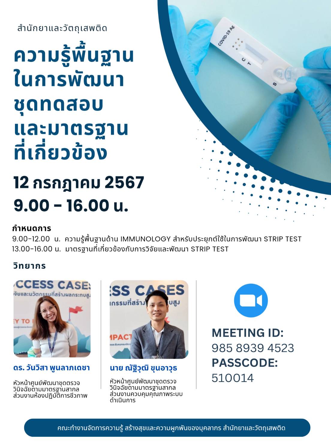 วิทยากร : ดร. วันวิสา พูนลาภเดชา หัวหน้าศูนย์พัฒนาชุดตรวจวินิจฉัยตามมาตรฐานสากล ส่วนงานห้องปฏิบัติการชีวภาพ
