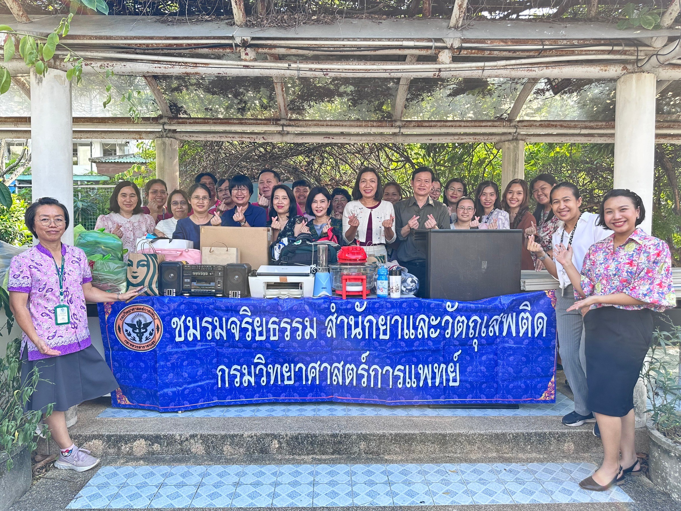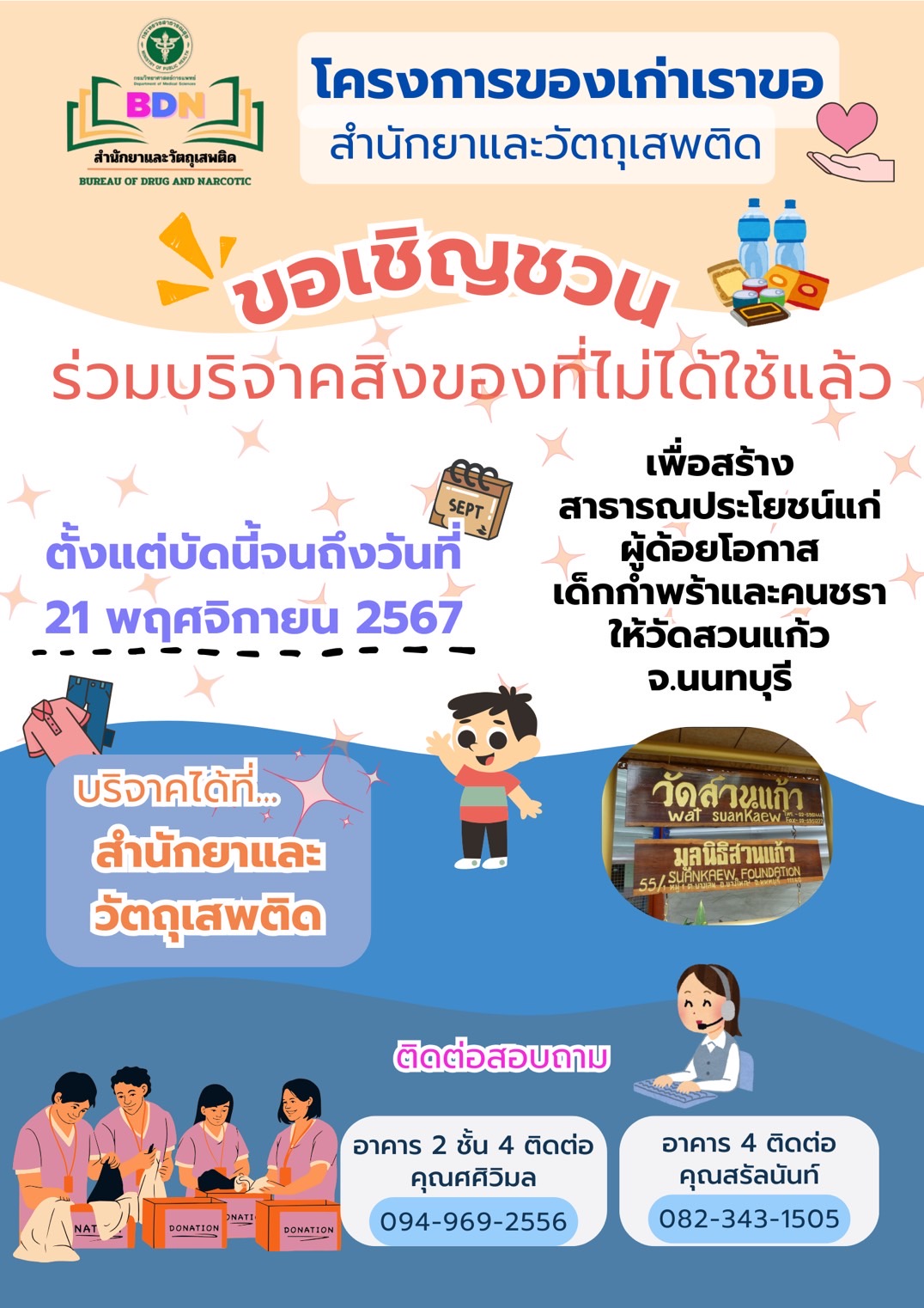 คณะทำงานจัดทำและขับเคลื่อนแผนปฏิบัติการส่งเสริมคุณธรรม สำนักยาและวัตถุเสพติดจัดกิจกรรม "โครงการของเก่าเราขอ" รับบริจาคสิ่งของที่ไม่ได้ใช้แล้ว ส่งให้วัดสวนแก้ว เพื่อเป็นสาธารณะประโยชน์แก่ผู้ด้อยโอกาส เด็กกำพร้า และคนชรา ณ วัดสวนแก้ว จ.นนทบุรี เมื่อวันที่ 3 ธันวาคม 2567