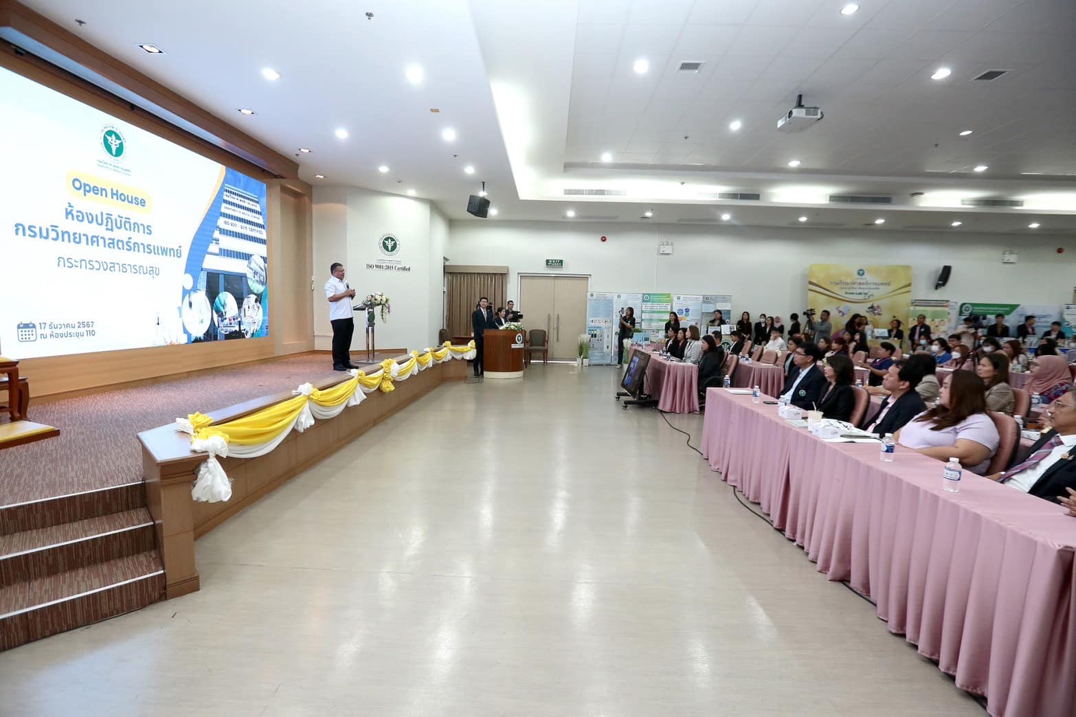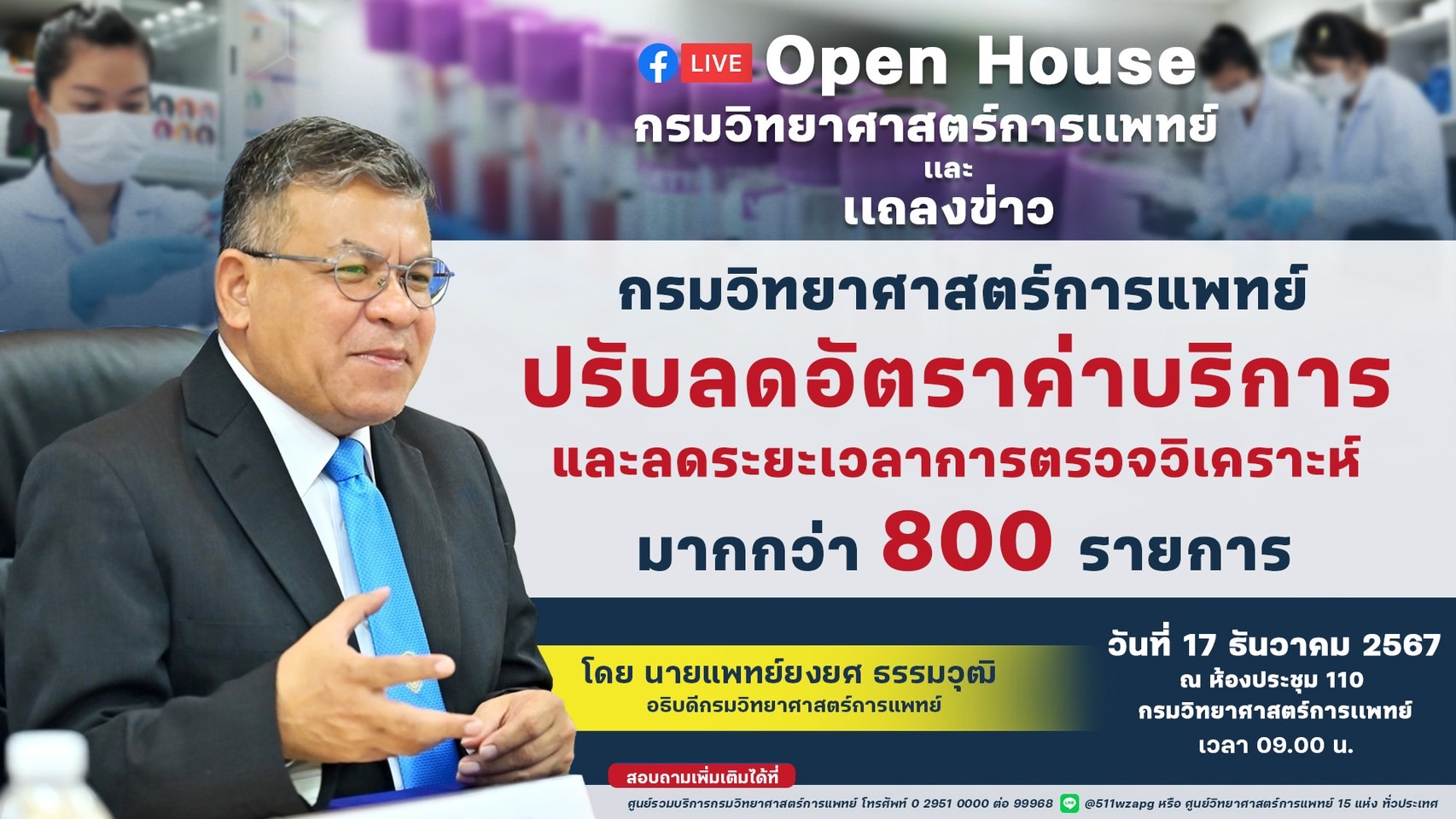 นายแพทย์ยงยศ ธรรมวุฒิ อธิบดีกรมวิทยาศาสตร์การแพทย์ เปิดโครงการสื่อสารประชาสัมพันธ์นวัตกรรม Open House ห้องปฏิบัติการกรมวิทยาศาสตร์การแพทย์ เพื่อสื่อสารประชาสัมพันธ์การดำเนินงานฯ แก่ผู้ประกอบการหน่วยงานภาครัฐ ภาคเอกชนได้รับทราบ ตลอดจนสร้างความเข้าใจ ความร่วมมือระหว่างกัน และแถลงข่าวการปรับปรุงการให้บริการที่รวดเร็วขึ้น 2 แพ็คเกจ เพื่อเป็นของขวัญปีใหม่ พ.ศ.2568 คือ ลดระยะเวลาการตรวจวิเคราะห์ทางห้องปฏิบัติการและลดอัตราค่าบริการ เพื่อส่งเสริมสนับสนุนและเพิ่มขีดความสามารถในการแข่งขันทางการค้า เกิดการพัฒนาผลิตภัณฑ์ได้อย่างยั่งยืนโดยมี นายแพทย์พิเชฐ บัญญัติ รองอธิบดีกรมวิทยาศาสตร์การแพทย์ ภญ.ศิริวรรณ ชัยสมบูรณ์พันธ์ ผู้ช่วยอธิบดีฯ และผู้อำนวยการสำนักยาและวัตถุเสพติด นางวิชาดา จงมีวาสนา ผู้อำนวยการสำนักคุณภาพและความปลอดภัยอาหาร นายสันตกิจ นิลอุดมศักดิ์ ผู้อำนวยการสถาบันวิจัยสมุนไพร นางสาวสุจิตรา คุ้มโภคา ผู้อำนวยการศูนย์รวมบริการ นายอาคม สาลี ผู้อำนวยการศูนย์เทคโนโลยีสารสนเทศ และผู้บริหารกรมวิทยาศาสตร์การแพทย์ ผู้ประกอบการ หน่วยงานภาครัฐ ภาคเอกชน และเจ้าหน้าที่กรมวิทยาศาสตร์การแพทย์เข้าร่วมงาน ณ ห้องประชุม 110 ชั้น 1 อาคาร 100 ปี การสาธารณสุขไทย กรมวิทยาศาสตร์การแพทย์ รวมทั้งมีการนำเสนอผลงาน นวัตกรรม และแนะนำห้องปฏิบัติการ การรับฟังข้อคิดเห็น ข้อเสนอแนะการให้บริการ แลกเปลี่ยนความคิดเห็น เพื่อพัฒนาการตรวจวิเคราะห์ได้ตรงกับความต้องการ และเปิดห้องปฏิบัติการสำนักยาและวัตถุเสพติด สำนักคุณภาพและความปลอดภัยอาหาร สถาบันวิจัยสมุนไพร ศูนย์รวมบริการให้ผู้ประกอบการและผู้สื่อข่าวที่ร่วมงานได้เข้าเยี่ยมชมอีกด้วย วันที่ 17 ธันวาคม พ.ศ.2567