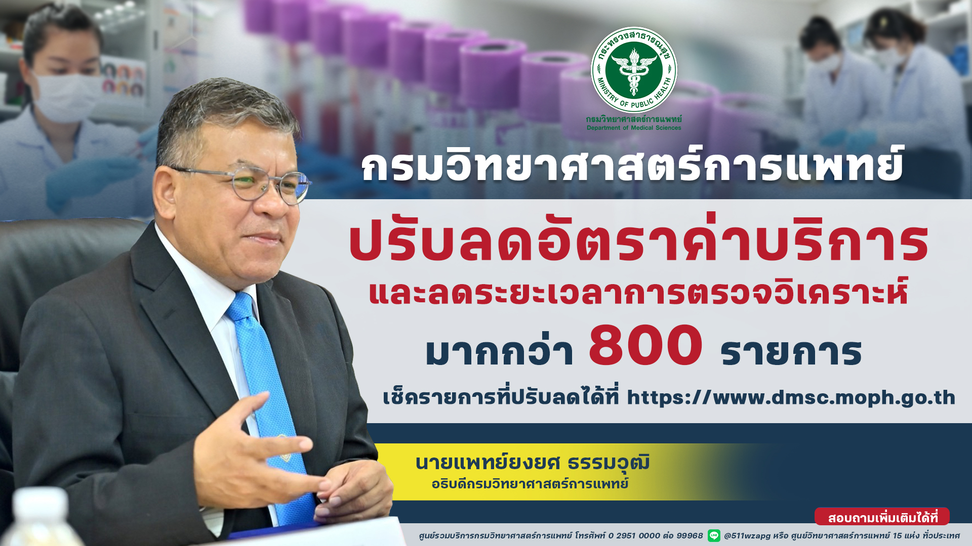 ทั้งนี้ ประชาชนและผู้รับบริการสามารถเข้าไปดูรายละเอียดเพิ่มเติมสำหรับรายการที่ปรับลดอัตราค่าบริการตรวจวิเคราะห์และผลิตภัณฑ์ที่มีการปรับลดระยะเวลาการตรวจวิเคราะห์ได้ที่เว็บไซต์กรมวิทยาศาสตร์การแพทย์ https://service.dmsc.moph.go.th/dmscservice/ หรือสอบถามได้ที่ศูนย์รวมบริการกรมวิทยาศาสตร์การแพทย์ โทรศัพท์ 0 2951 0000 ต่อ 99968 และผ่านทางแอพพลิเคชั่น LINE โดยกดเพิ่มเพื่อนที่ @511wzapg หรือศูนย์วิทยาศาสตร์การแพทย์ 15 แห่งทั่วประเทศ ในวันจันทร์-ศุกร์ เวลา 08.30-16.30 น. (ยกเว้นวันหยุดราชการ) หรือสแกน QR Code นี้ อีกช่องทางหนึ่ง” นายแพทย์ยงยศ กล่าวทิ้งท้าย