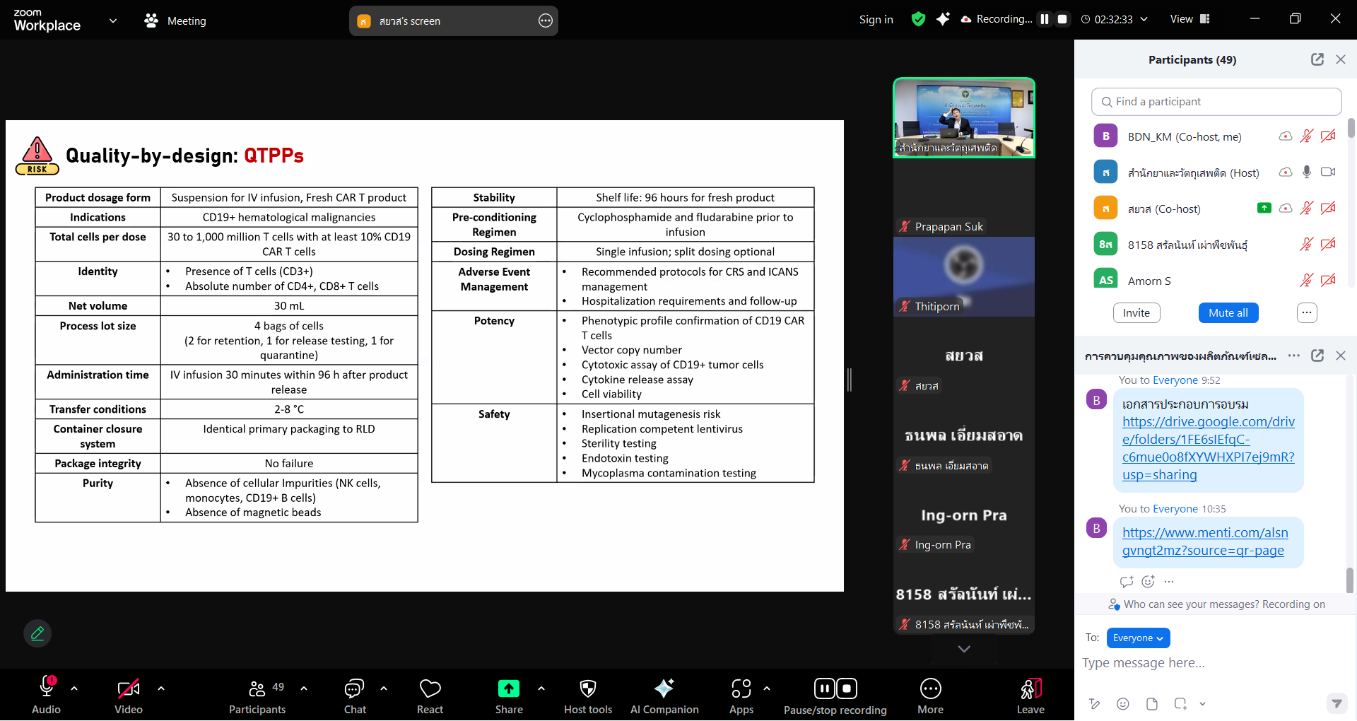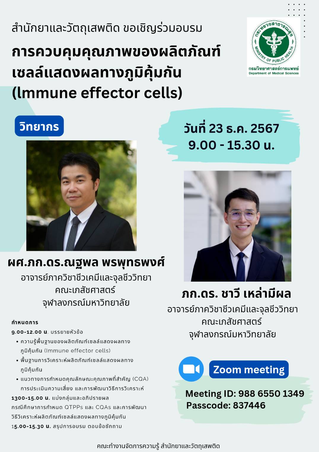 ดังนั้น คณะทำงานจัดการความรู้ สำนักยาและวัตถุเสพติด นำโดยเภสัชกรหญิง นางศิริวรรณ ชัยสมบูรณ์พันธ์ ผู้อำนวยการสำนักยาและวัตถุเสพติด ได้เห็นความสำคัญการควบคุมคุณภาพ ให้ผู้บริโภคได้รับผลิตภัณฑ์ที่มีความปลอดภัยและผ่านเกณฑ์มาตรฐานระดับสากล จึงอนุญาตให้จัดโครงการอบรม เรื่อง “การควบคุมคุณภาพของผลิตภัณฑ์เซลล์แสดงผลทางภูมิคุ้มกัน (Immune effector cells)” ณ ห้องประชุมตำรายา และทางออนไลน์ผ่านระบบ Application Zoom meeting เมื่อวันที่ 23 ธันวาคม 2567 โดยได้รับเกรียติ์อาจารย์ภาควิชาชีวเคมีและจุลชีววิทยา คณะเภสัชศาสตร์ จุฬาลงกรณ์มหาวิทยาลัย มาบรรยายให้ความรู้ในหัวข้อ