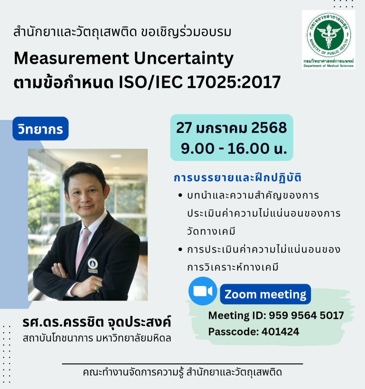 จากข้างต้น เพื่อความน่าเชื่อถือของผลการวิเคราะห์ และการเตรียมความพร้อมรองรับการตรวจประเมิน ในการขอรับรองระบบคุณภาพ ซึ่งใช้ในการดำเนินงานตามภารกิจหลักของหน่วยงาน ดังนั้น ทางคณะทำงานจัดการความรู้ จึงได้รับอนุมัติจากผู้อำนวยการสำนักยาและวัตถุเสพติด ภญ.ศิริวรรณ ชัยสมบูรณ์พันธ์ ให้จัดโครงการอบรม เรื่อง “Measurement Uncertainty ตามข้อกำหนด ISO/IEC 17025 : 2017” โดยได้รับเกรียติ์จาก รศ.ดร.ครรชิต จุดประสงค์ รองศาสตราจารย์สถาบันโภชนาการ มหาวิทยาลัยมหิดล มาบรรยายและฝึกปฏิบัติ ในหัวข้อ