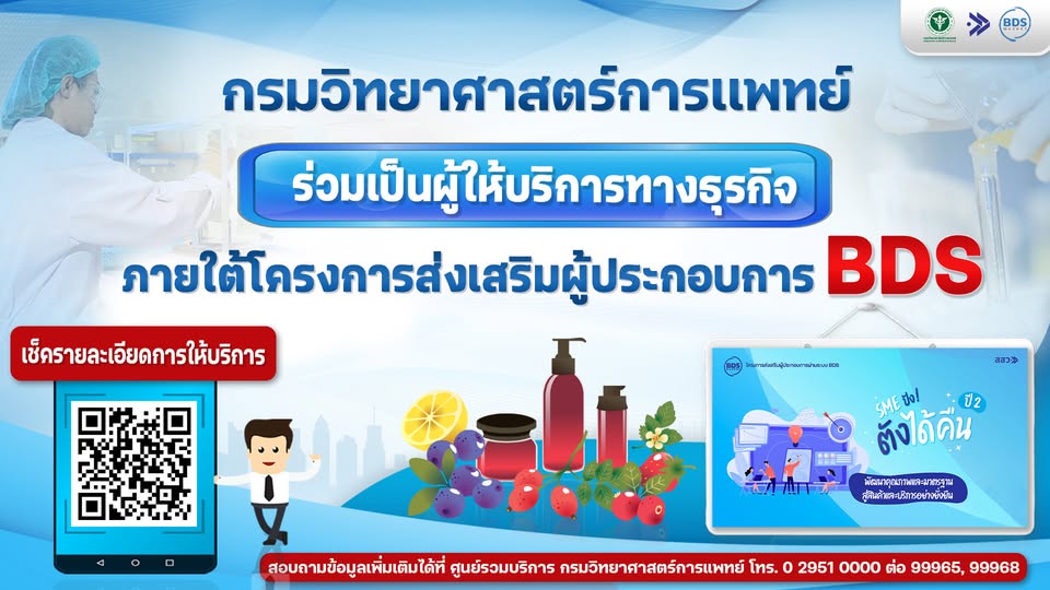 กรมวิทยาศาสตร์การแพทย์ ร่วมกับสำนักงานส่งเสริมวิสาหกิจขนาดกลางและขนาดย่อม (สสว.) เป็นผู้ให้บริการทางธุรกิจ ดำเนินโครงการส่งเสริมผู้ประกอบการผ่านระบบ BDS สำนักงานส่งเสริมวิสาหกิจขนาดกลางและขนาดย่อม ในด้าน "การพัฒนาคุณภาพและมาตรฐานสินค้าและบริการ"