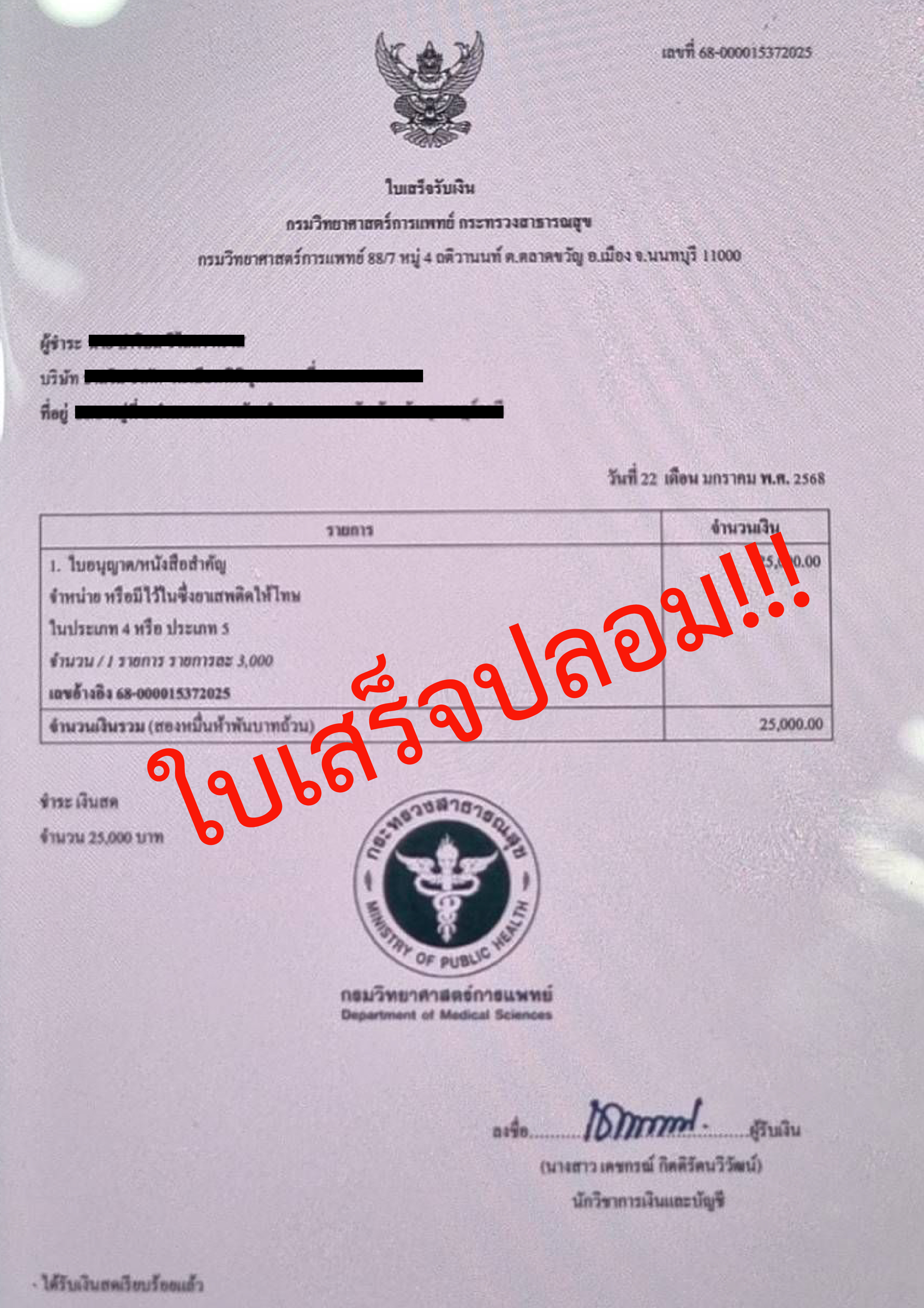 นายแพทย์ยงยศ ธรรมวุฒิ อธิบดีกรมวิทยาศาสตร์การแพทย์ เปิดเผยว่า กรมวิทยาศาสตร์การแพทย์ได้รับการแจ้งจากเจ้าหน้าที่กรมการแพทย์แผนไทยและการแพทย์ทางเลือก ให้ตรวจสอบใบเสร็จรับเงิน เพื่อให้ออกใบอนุญาตจำหน่ายหรือมีไว้ในซึ่งยาเสพติดให้โทษในประเภท 4 หรือประเภท 5 เลขที่ 68-000015372025 ลงวันที่ 22 มกราคม 2568 ว่าเป็นใบเสร็จรับเงินของกรมวิทยาศาสตร์การแพทย์จริงหรือไม่ จากการตรวจสอบพบว่า เป็นใบเสร็จรับเงินปลอม ที่มิจฉาชีพทำขึ้นมาเพื่อหลอกลวงประชาชนและผู้ประกอบการ อีกทั้งกรมวิทยาศาสตร์การแพทย์ ไม่ได้มีอำนาจในการออกใบอนุญาตจำหน่ายหรือมีไว้ในซึ่งยาเสพติดให้โทษ โดยภารกิจที่กรมดำเนินการที่เกี่ยวข้องกับยาเสพติด จะเป็นเรื่องการพัฒนาคุณภาพการตรวจวิเคราะห์ การตรวจวิเคราะห์ของกลางยาเสพติด รวมทั้งตรวจสารสำคัญเท่านั้น จึงขอเตือนภัยให้ผู้เกี่ยวข้อง และประชาชนอย่าหลงเชื่อ